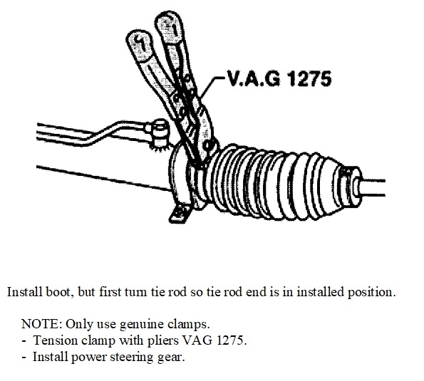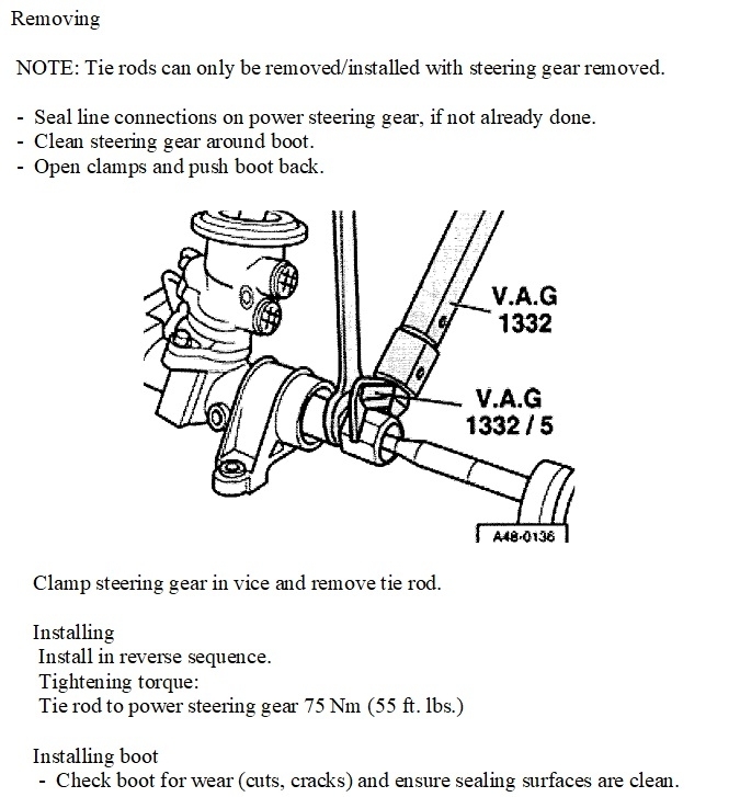 Note that this procedure specifies removing the steering gear from the vehicle. That is a huge waste of time when we have to charge our customers by the hour. I would, however, still try to get an open-end wrench on the steering rack, as they show, to avoid putting rotational stress on that rack. You aren't likely to twist the rack, but often it's sliding back and forth on plastic or nylon supports. There's also internal adjustments to set the preload or free play on the rack. Those parts could be damaged from using excessive force to loosen the old tie rod end. Be sure to use a click-type torque wrench to tighten the new tie rod to 55 foot pounds. That is needed to prevent it from coming loose over time.