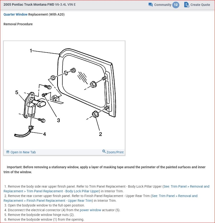 Here is the procedure to remove the quarter glass. Please let me know if you need anything else. Check out the diagrams (Below). Please let us know if you need anything else to get the problem fixed. Thanks