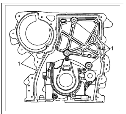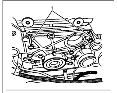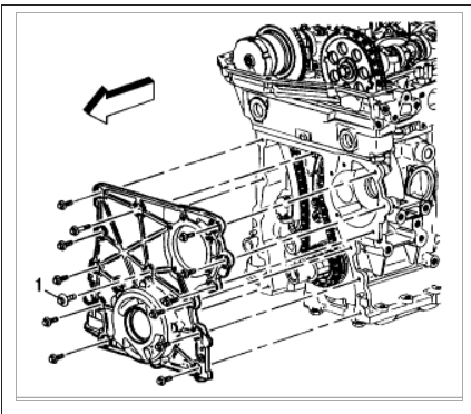 Install the front cover bolts, tightening the center bolt last (1).