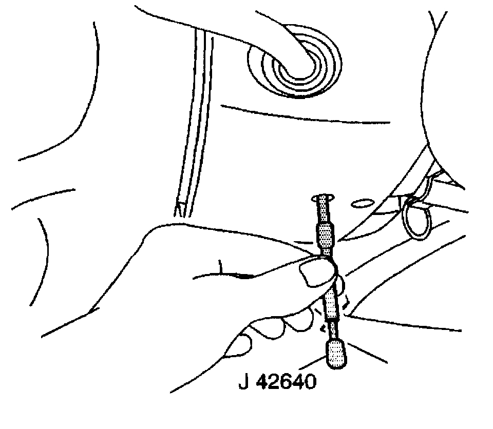 9. Unlock the steering column by removing the J 42640 from the steering column lower steering column trim cover access hole.