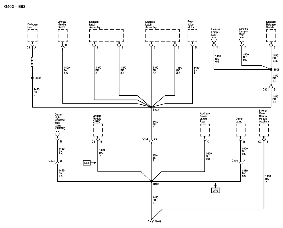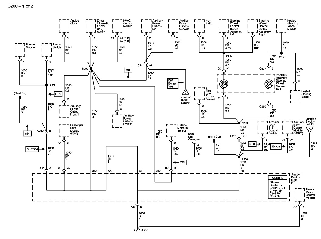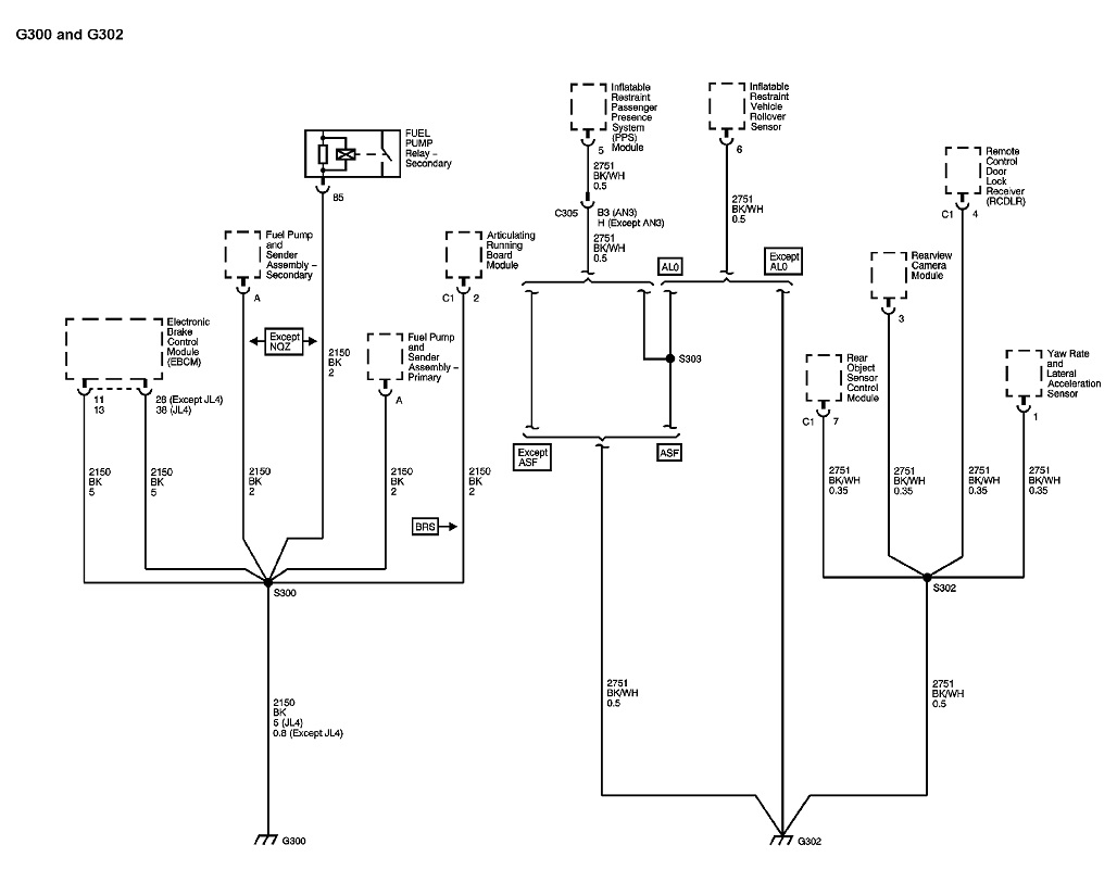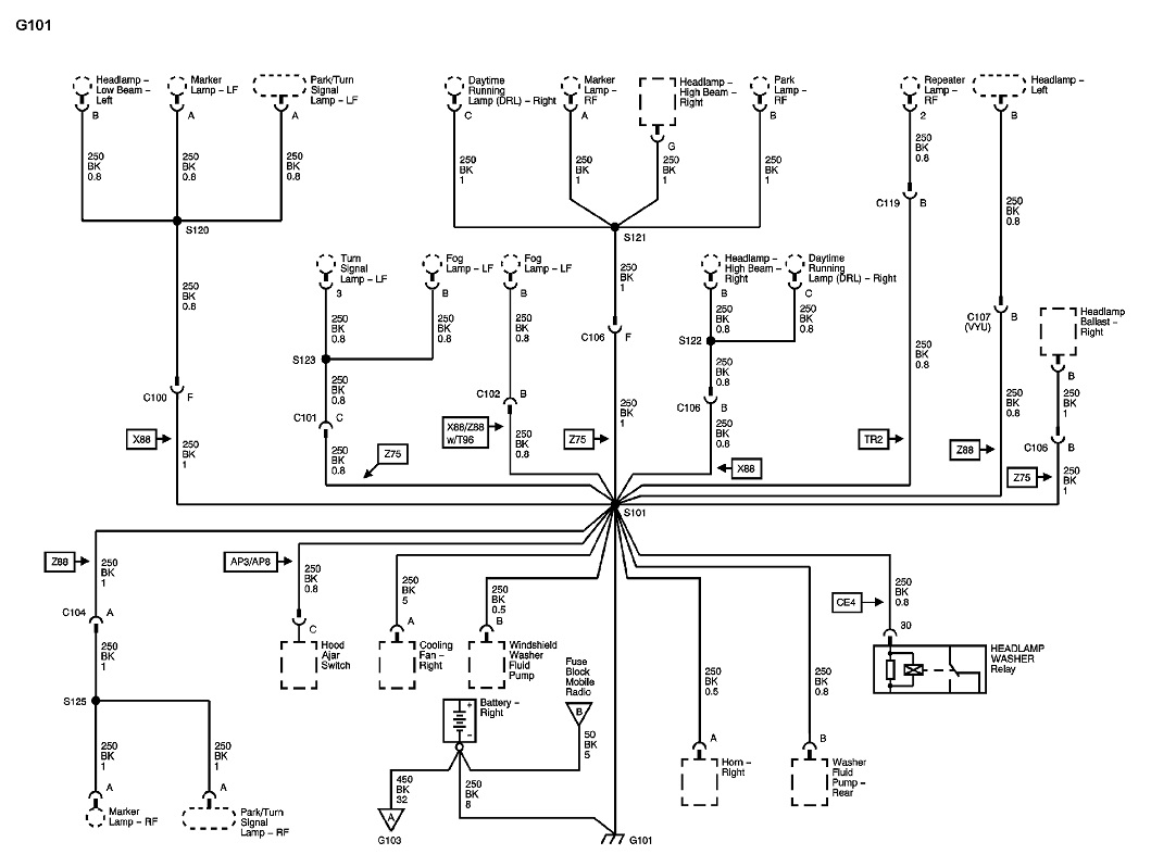 These are the diagrams that show all the ground circuits on your truck. In the first one, my blue arrow at the bottom is pointing to the symbol used to indicate the ground terminal that is bolted to the body sheet metal or frame. You'll see there are grounds for a lot of circuits that are all tied together in any one ground terminal. That means two things can happen. If a ground terminal is rusted where it bolts to the sheet metal, or the wires are corroded inside that terminal, all of those multiple circuits may be dead, or, . . . current flowing through one circuit will not be able to find its path to ground, but will "back feed" backwards through one of the other circuits, causing both circuits to try to work, but incorrectly. A real common example of this is with a bad ground at a rear light assembly, a turn signal appears to work normally until the head and tail lights are turned on, then the signal stops flashing.