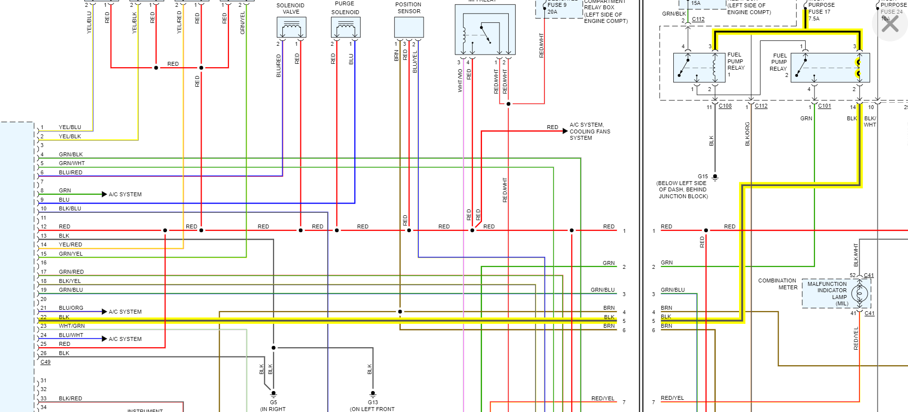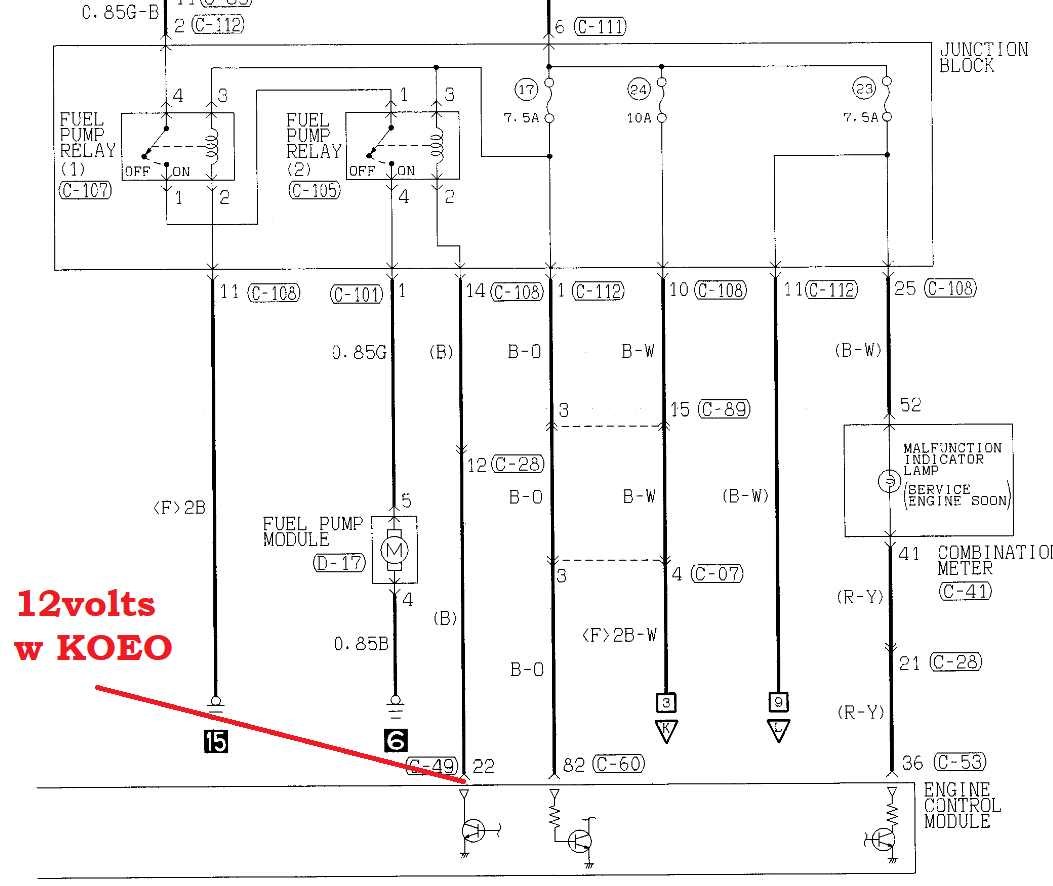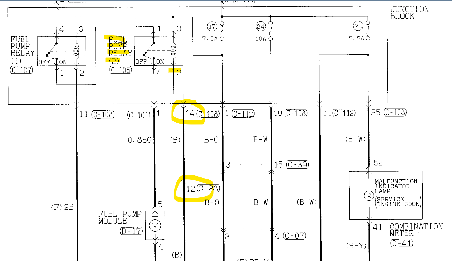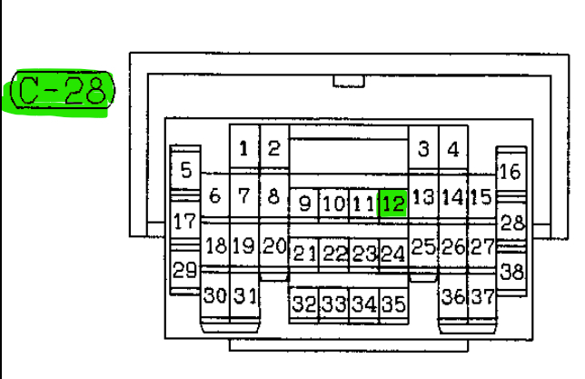 The C28 connector looks like it's in a pretty difficult place, somewhere in the lower center console. So, checking the circuit from the relay to the ECM connector for an open circuit to begin with will be easier. I'll find the ECM pinout.