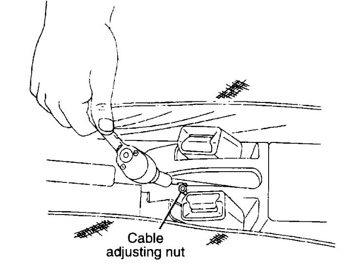 3. Adjust the cable length with adjuster nut so that the number of sector notch is 5 - 7 when pulling force of 10 kg.
