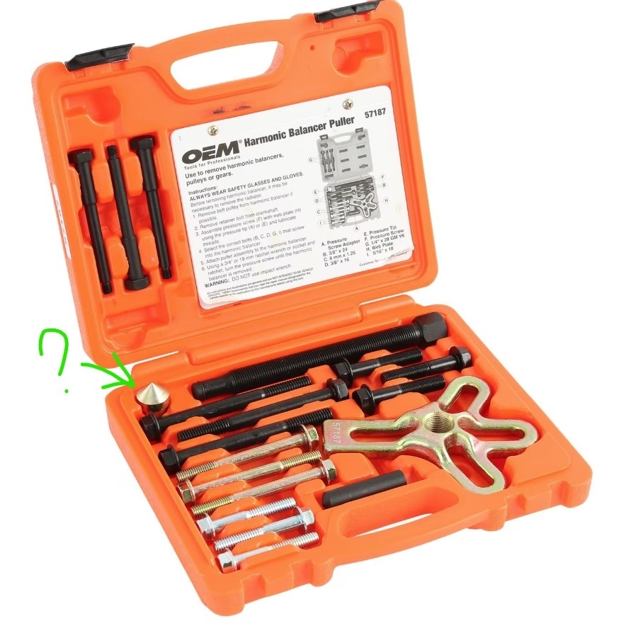I rented a harmonic balancer removal tool from auto zone. I have the tool connected with the pointed end cap pointed inside the bolt hole and began turning the center bolt. After some turning of the center bolt i am hearing a cracking noise about one per revolution. After about 3-4 times hearing that, I stopped, disconnected tool and now the center cover tip piece is stuck about 1/2 in the center hole. I am worried about continuing tightening the puller incase I am damaging threads, but cannot get cap out to reinstall Crank bolt to use. Any suggestions? I do not know if the pulley has come out at all so far.