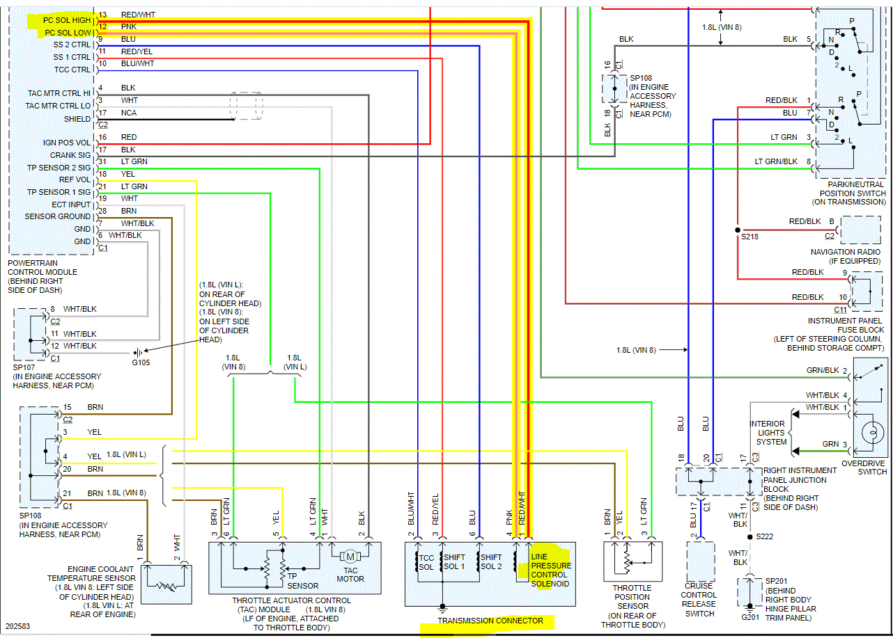 If you look at the first two pics below, I provided the wiring schematic. It was a page long, but I had to cut it in half to make it readable for you. I did overlap them and highlighted the wires related to the solenoid and where they connect at the PCM.