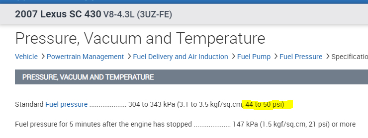 I attached the manufacturer's fuel pressure specifications below.