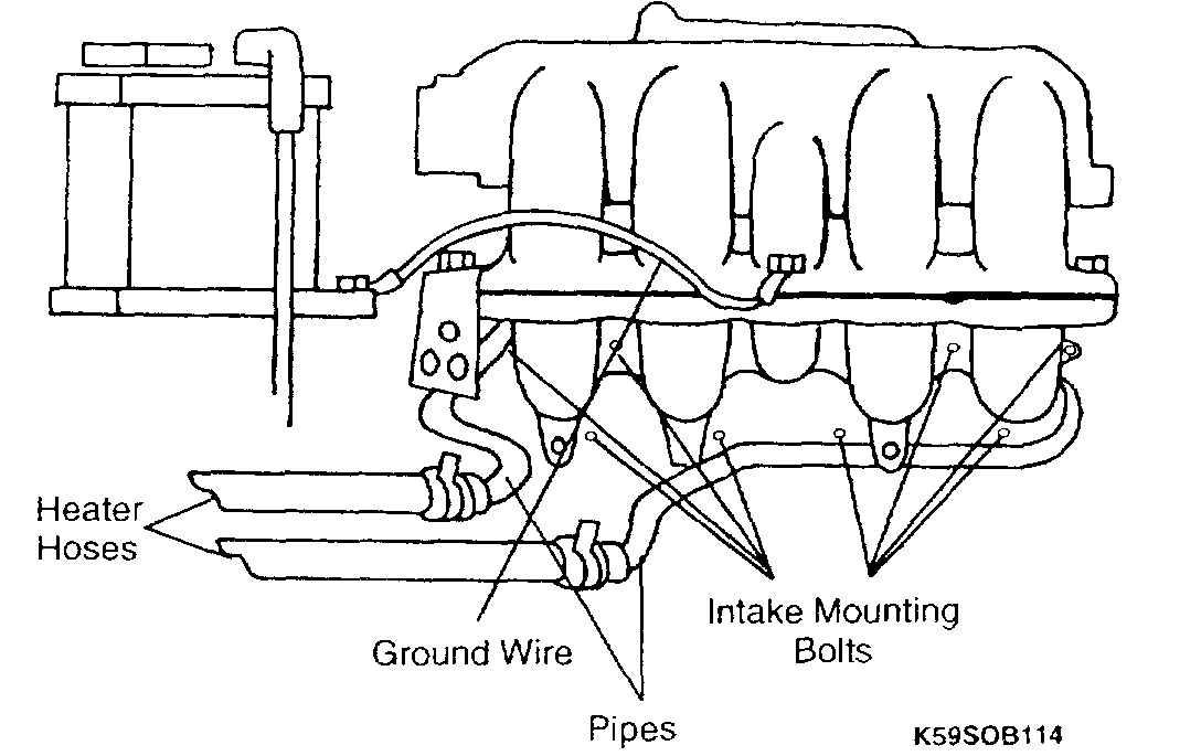 8. Remove the engine-to-body ground wire from the intake manifold and the harness bracket below it.
