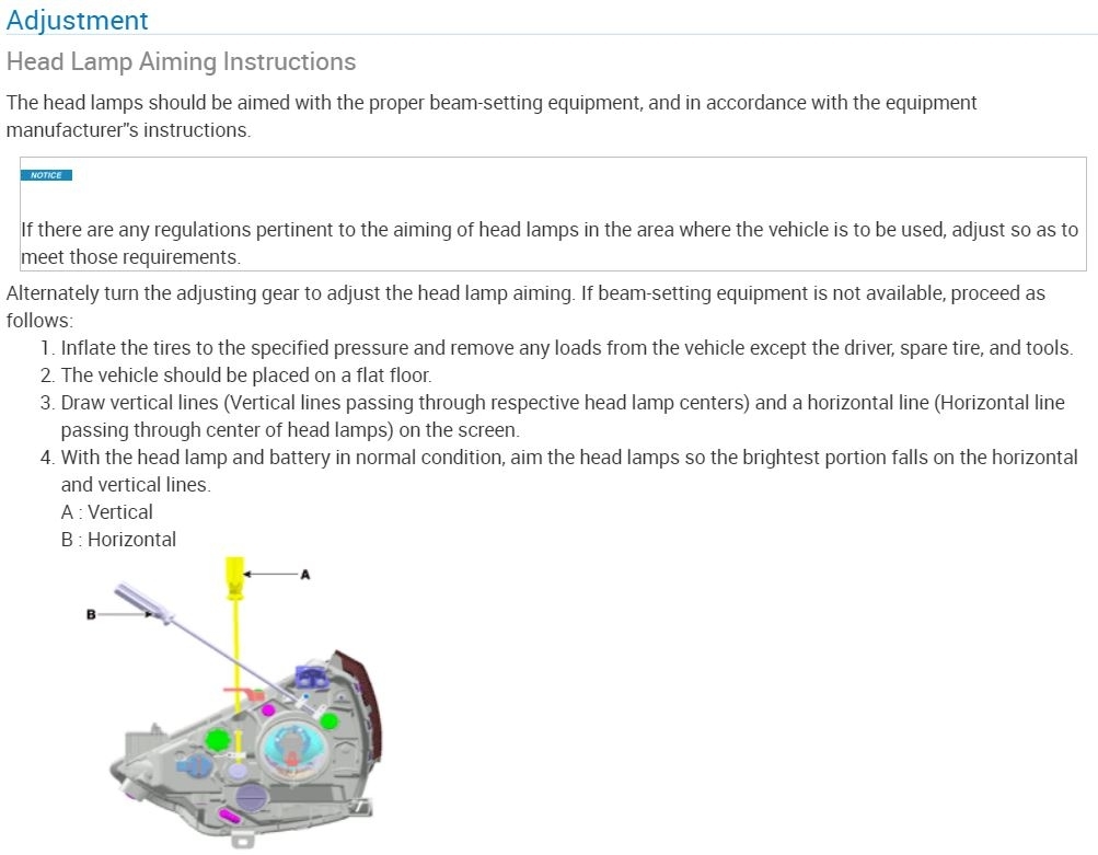 Attached below is the headlamp aiming procedure. The second attachment is a zoomed in few of the adjustment screw locations. Check out the diagrams (Below). Please let us know if you need anything else to get the problem fixed.