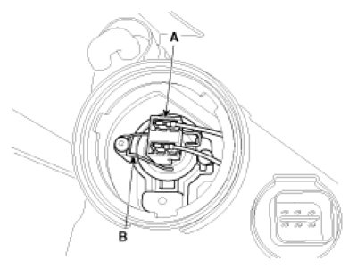 4. Remove the fixing clip (B) and connector (A) from the head lamp (High) bulb.