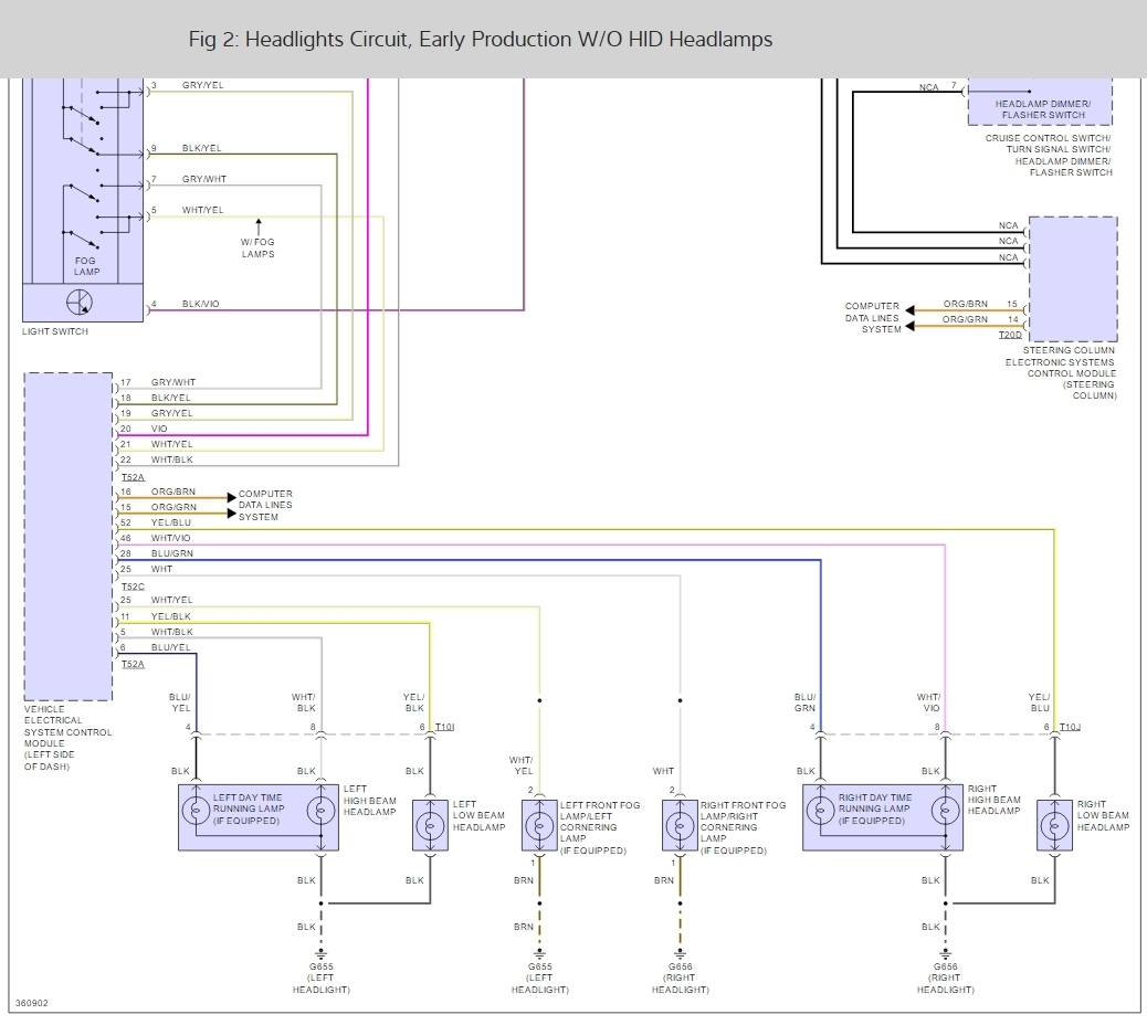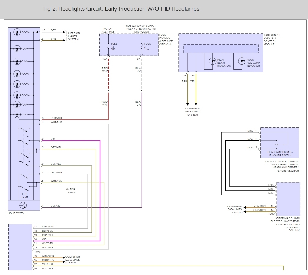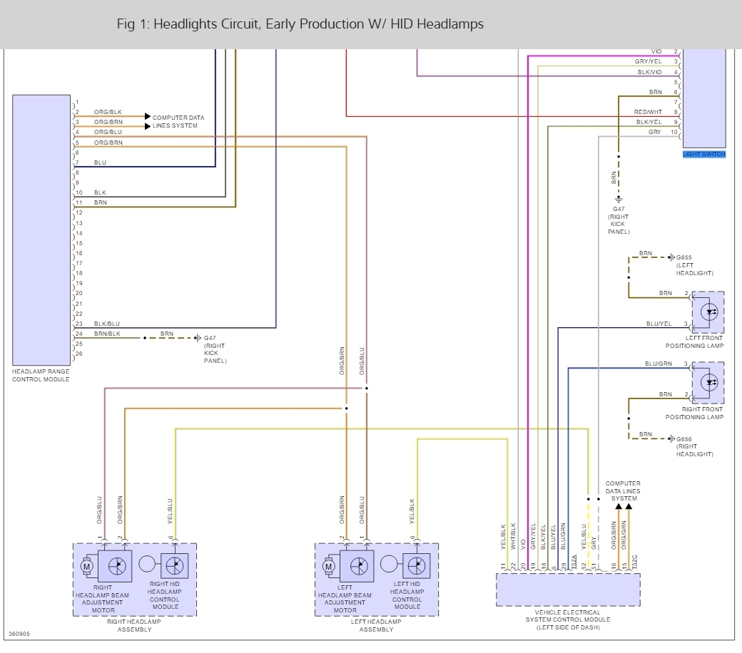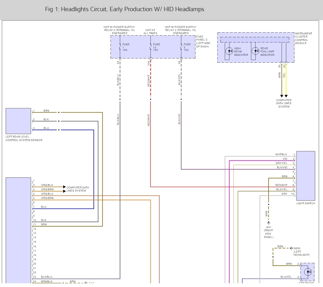 It looks like there are some headlight modules and amplifiers. Here are some wiring diagrams which show you what to look for. Test for power and then tracy it back until you find where the power is lost.