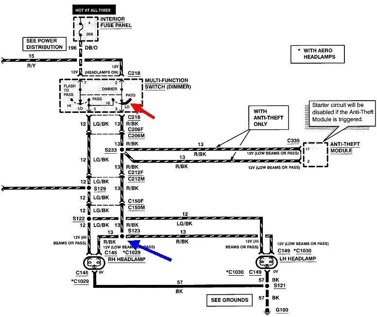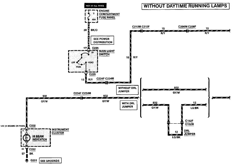 If you're on the verge of becoming confused, this will finish the job, so don't read any further if that's the case. This isn't an important detail, but this is the perfect circuit to explain the most efficient way to do this type of testing. Some people will find the 12 volts missing at the head lights, then work back to connector C150, then back to C212, then to C206, and then to the multi-function switch. If the bad connection is at the switch, it could be an hour of crawling around before they find it. My preference is to start at the switch, then move on to connector C206, then C212, and then to C150, in that direction. I risk wasting time to get all the way to the last splice before I find the cause of the problem.