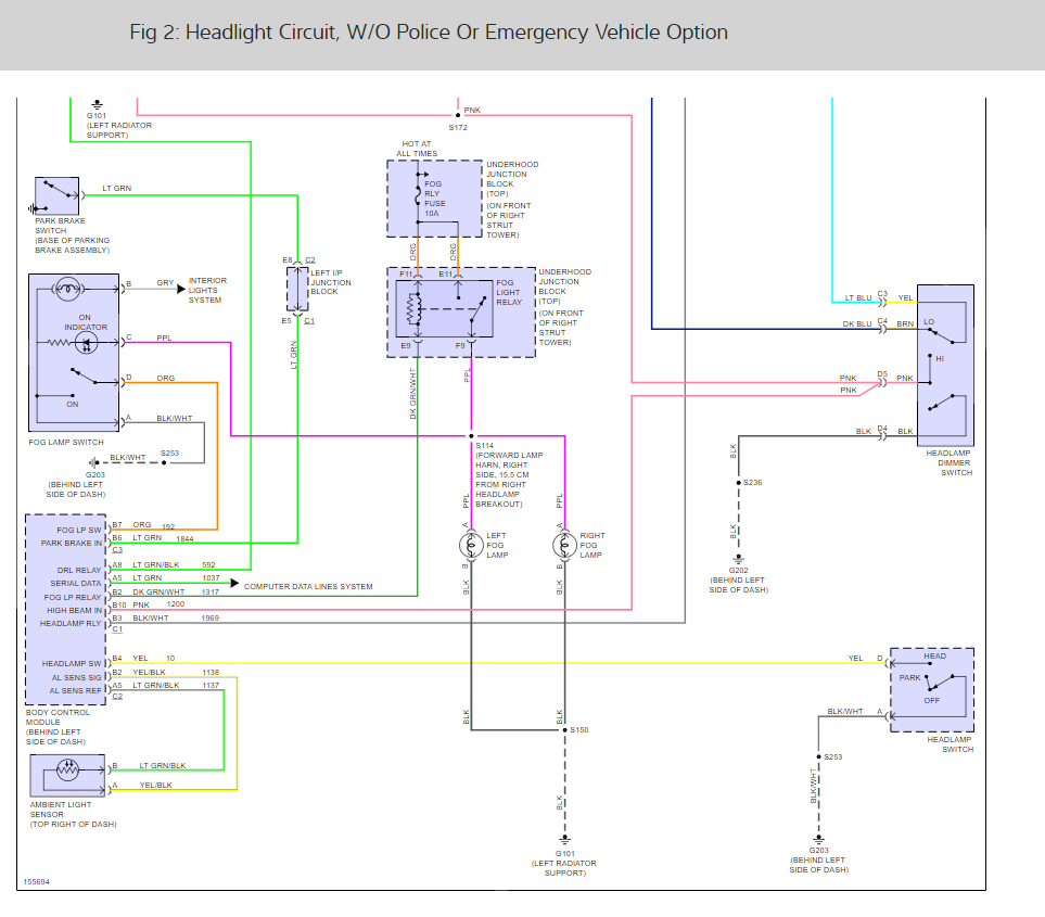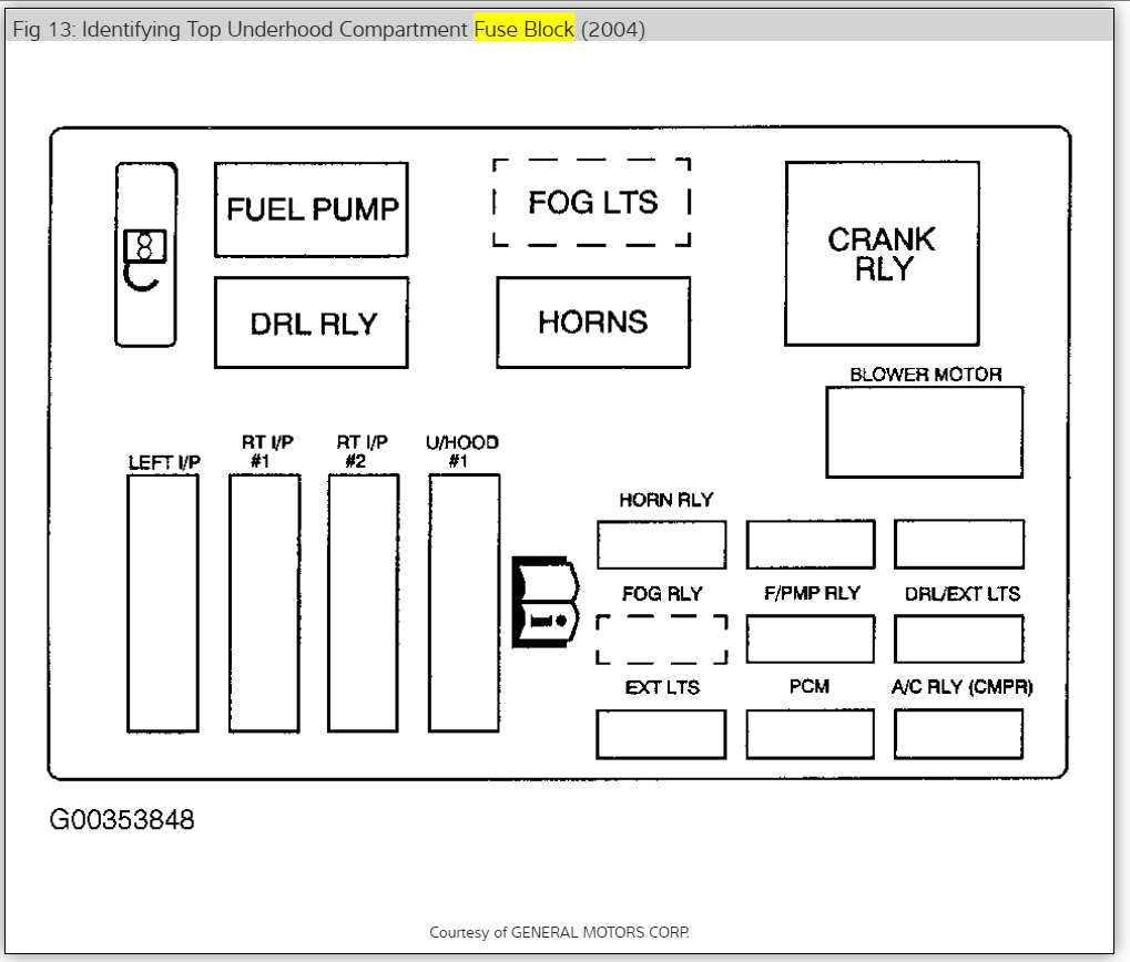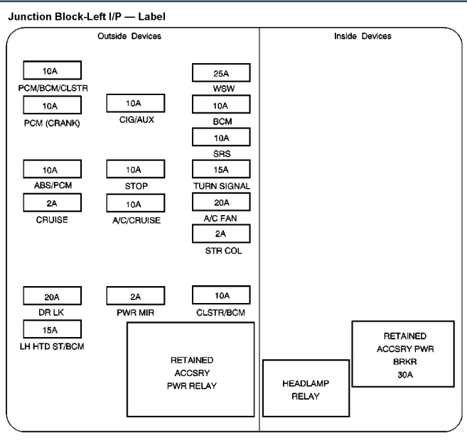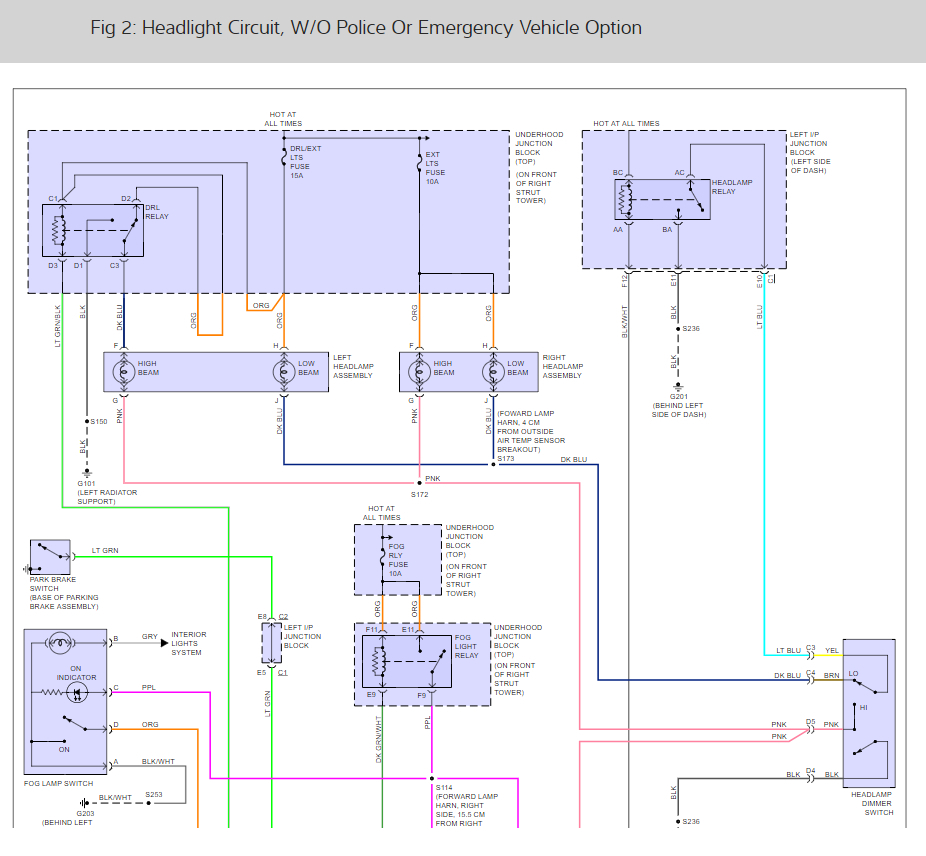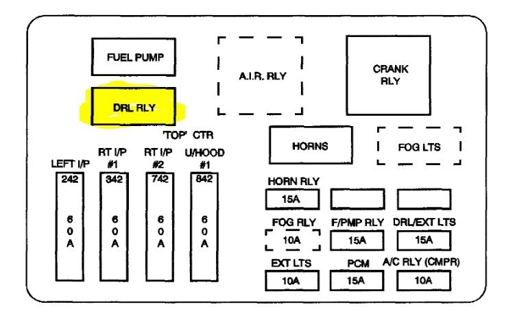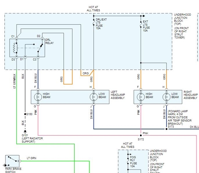 Correct the headlamp relay controls all the headlights. Fuse - one feeds both high beams other feeds both low beams. Does the lamp work when the daytime running lights come on? If not and no high beam then it is one of two things, either the DRL relay in the under hood junction box has failed and it isn't switching or the wiring has a problem. Testing the wiring will need a jumper wire or a test light. If you look at the wiring diagram the pink wire to the left headlight is the first to test. It is the ground control from the switch. With a test light connected to the battery positive and touched to the pin connected to the pink wire, with the headlight switch and key on the light should come on if the wire from the other side is good. If the light comes on you will want to check the DRL relay in the box under the hood as it may be faulty. On some of the GM's the pins are marked on the relays and on the fuse box. Others are only on the relay. To test the relay socket you can put the test light onto battery positive, then use the probe with the key on and headlights on. First touch the relay box terminal that pin 87 connects to, the light should come on, that verifies that the ground for that pin is good, next test pins 85 and 86. One will light the light as it's the ground to the control module. Now connect the test light to ground. Now touch 85 and 86 again. One will light the light if there is power to the relay. Next touch pins 87A and pin 30. The light should be bright on both if the wiring is good. If they all test out then replace the relay, or if you don't want to do the testing you could just replace the relay as the test. However the testing would show if there was a wiring issue.