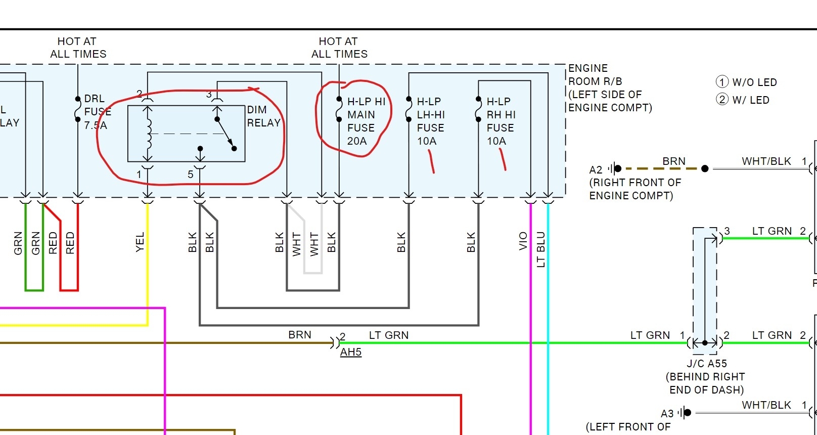 Well, there are 3 fuses and one relay that powers both high beams. All are in the under-hood relay box on the left side. The relay is the dim relay. It toggles to turn on the high beams. Testing isn't hard. Pull the relay out and use a test light to look for the power feeds. Pins 2 and 3 should be battery voltage with the key off. Now use a short wire to jump between terminal terminals 3 and 5. If the wiring fuses and bulbs are good, they should light. Now to test the actuator signal you can use the test light between terminal 1 and battery positive. Switch low to high and the test light should light on high. If the trigger wire works and the lights came on when you jumped power the relay is bad. If the lights didn't light when you jumped power, then check the 2 fuses for the high beams.