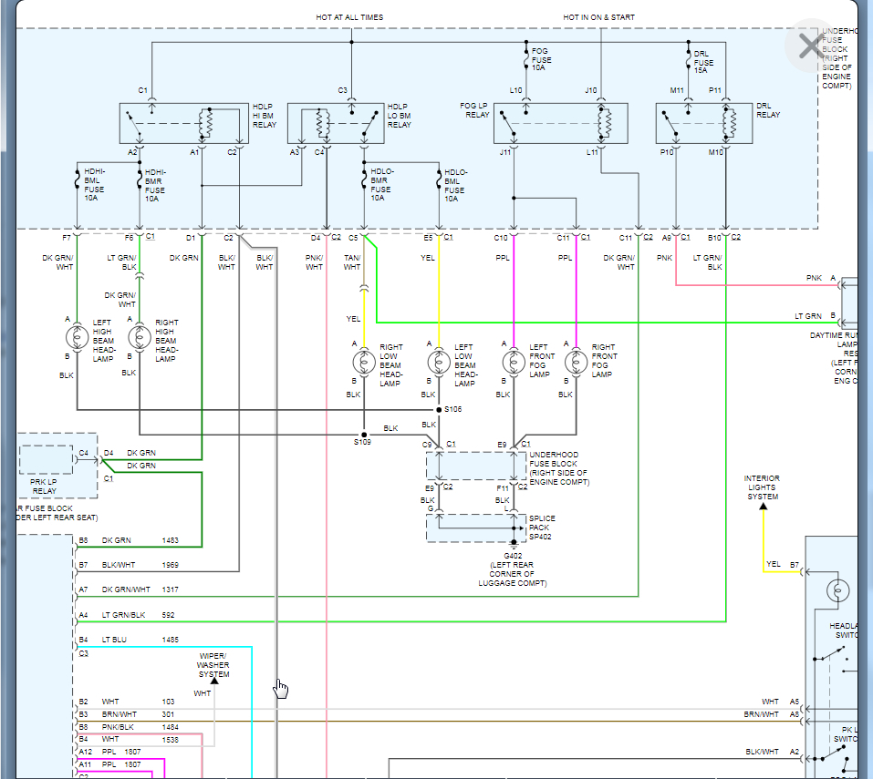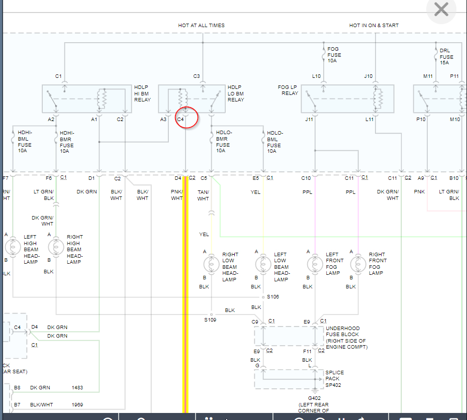 I would suggest starting with checking the signal from the switch to the relay. The last attachment below shows a close up on this wire from the switch to the relay. We need to test this by removing the relay and putting your red meter lead on battery positive and the black lead on the terminal of this wire and turn the headlights on. You should have 12 volts on the meter as the switch grounds this circuit to close the relay and that sends voltage to the headlights.