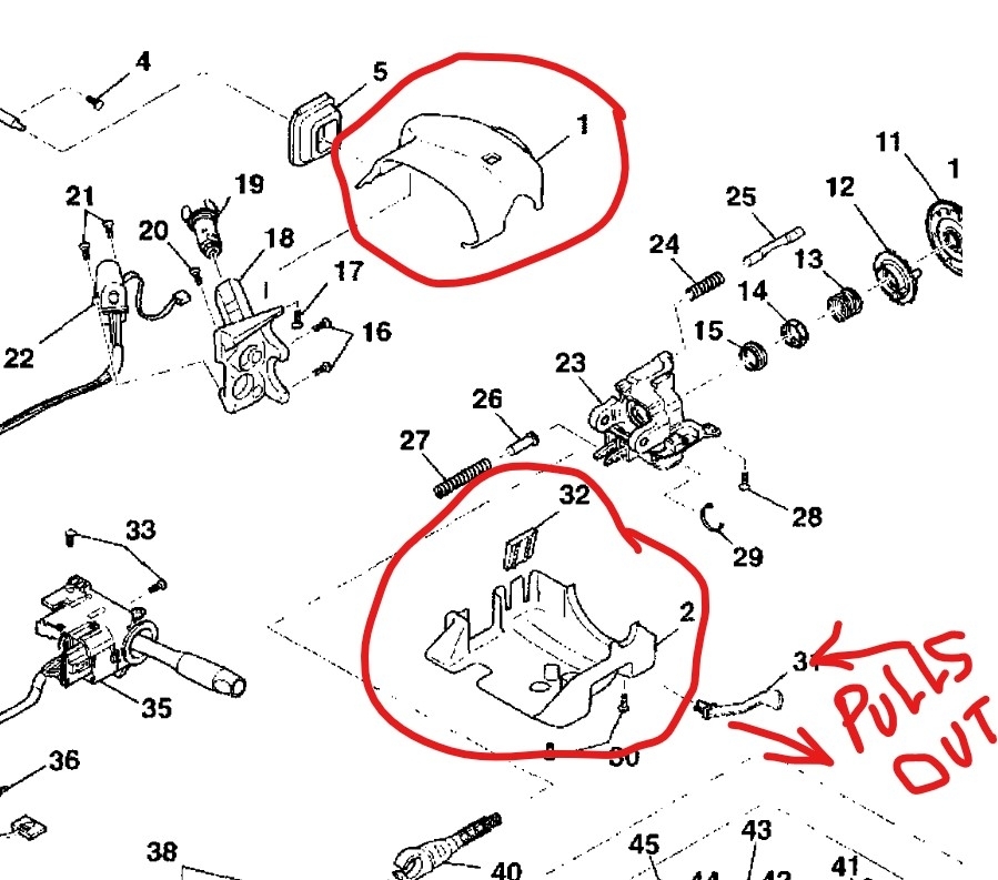 6. Remove the steering column trim covers. These are both clipped and screwed in place. Remove the screws and if you have a tilt column put it tilted down just a bit, then pull straight out at the base of the tilt lever and it should pop free. Remove the screws in the bottom cover and drop it off.