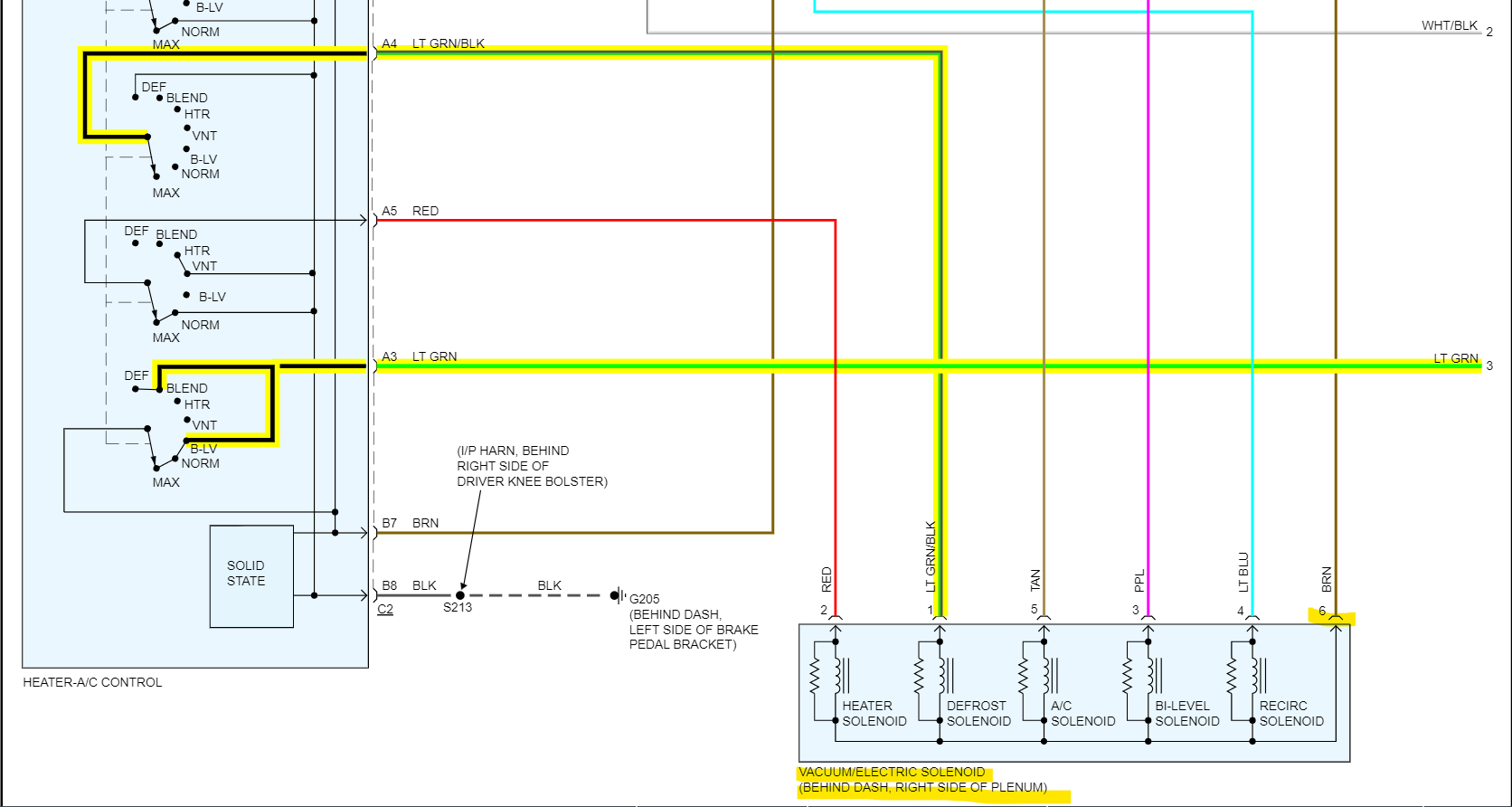 Pin 6 in the corrector (3rd diagram brown wire) is a 12volt feed, I'm not sure why they label it as an Output. But there should be 1 vacuum hose coming to the solenoid module with constant vacuum while the engine is running. If that solenoid for the Defrost has shorted out, it should pop the Fuse 4 15amp. But if there is a vacuum leak causing the issue, it will usually affect the engine too causing it to run lean due to the extra air being drawn in.