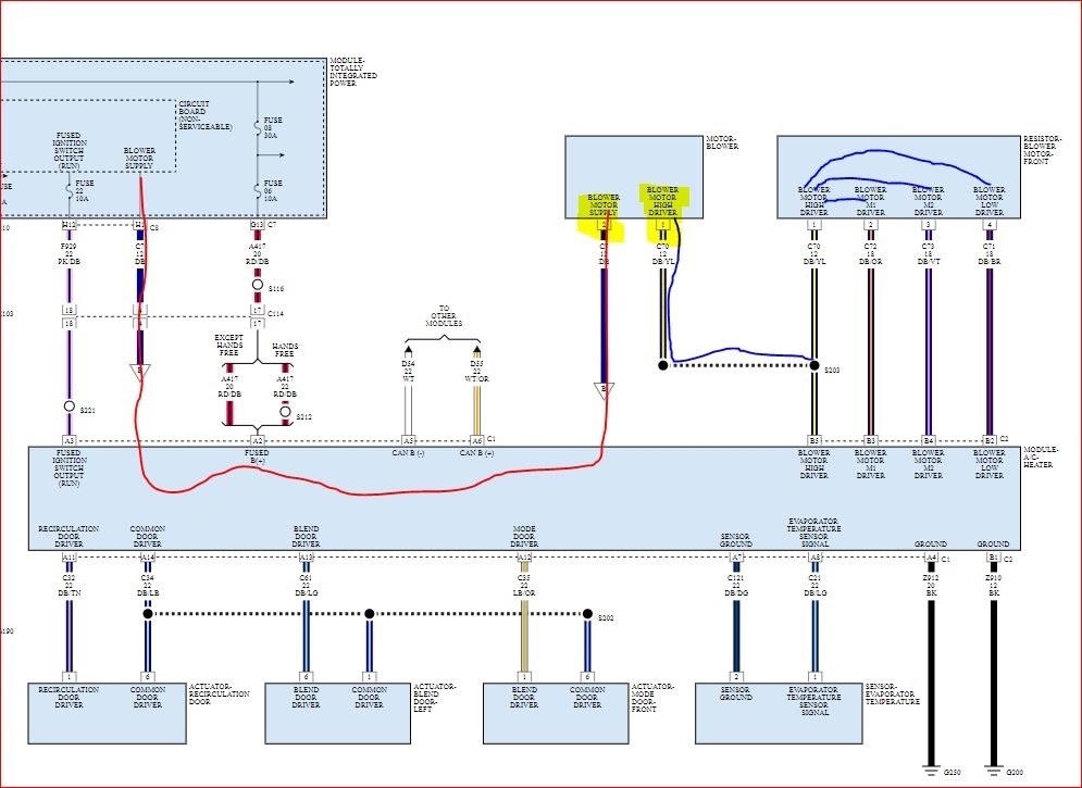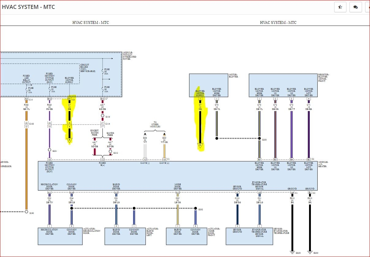 I included the wiring diagram with some drawings on it that explain the power flow. My red line is 12 volt supply. The blue is the power that varies from the control module through the resistor to the blower motor.