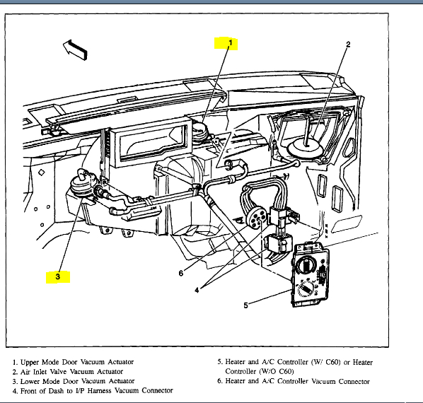 Pic 1 below is the vacuum schematic for your vehicle. Pic 2 shows where the actuators are located for airflow direction. Pic 3 shows the vacuum supply from the driver's side of the engine to a vacuum tank and through the firewall into the controller. I suspect one of these lines is broken, disconnected, or cracked.