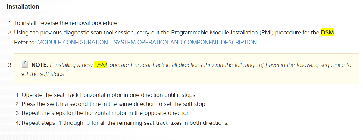 NOTE: When installing a new Dual Climate Controlled Seat Module (DCSM) , it is necessary to carry out Programmable Module Installation (PMI). For additional information, refer to Section 418-01 See: Information Bus > Programming and Relearning > Programmable Module Installation (PMI).