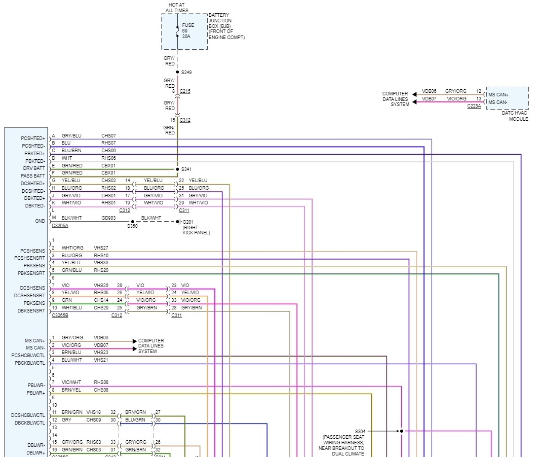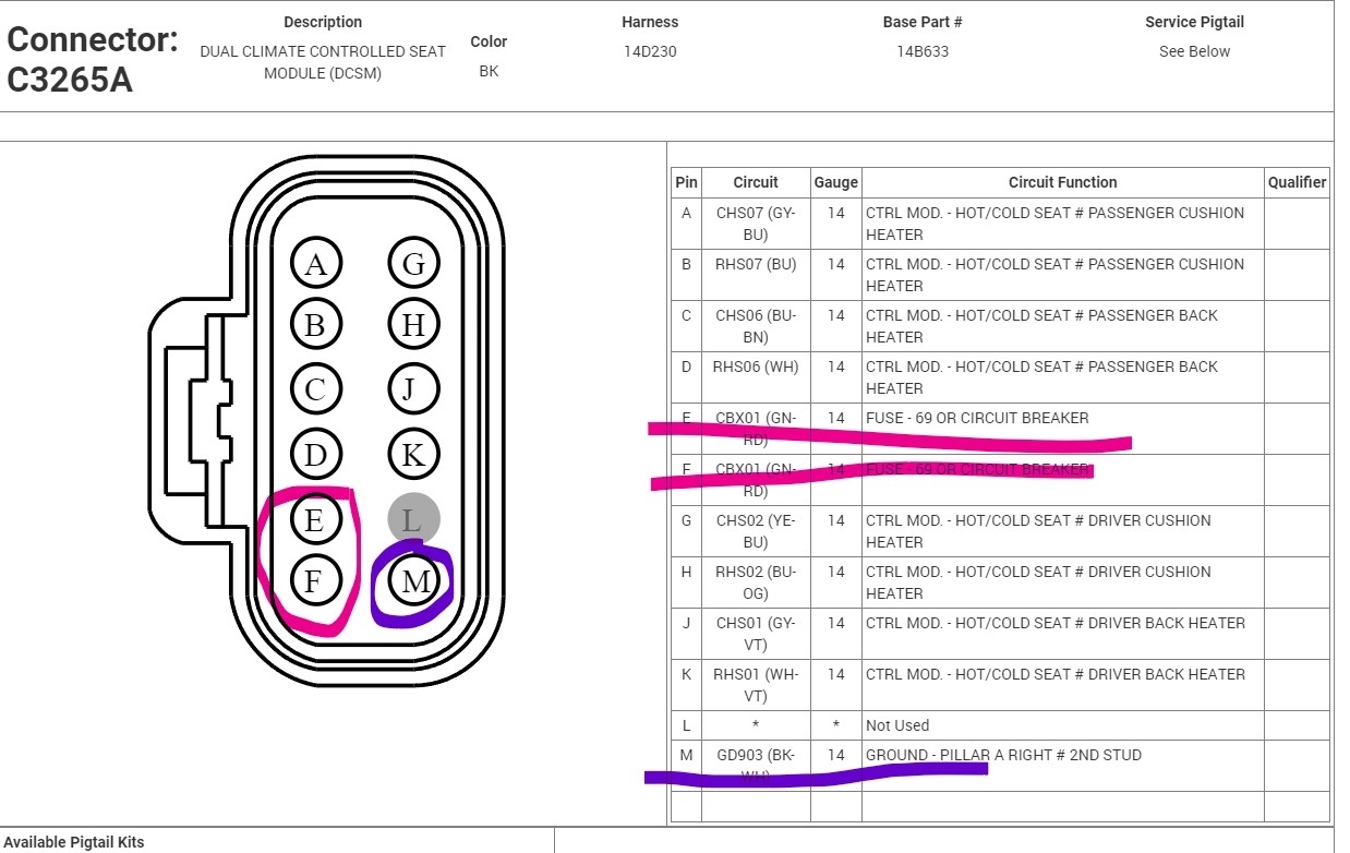 Okay, the first thing will be to check the 30-amp fuse that powers the seat heater system. It is fuse 69 in the battery junction box under the hood. If it tests good, then we need to go to the seat control module under the passenger seat and check there for the powers and grounds. The power wires are Green with red stripes and are in terminals E and F in connector 3265A