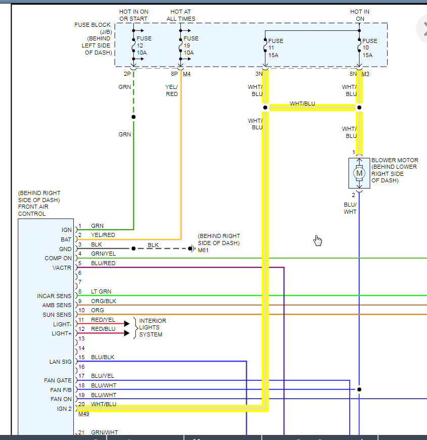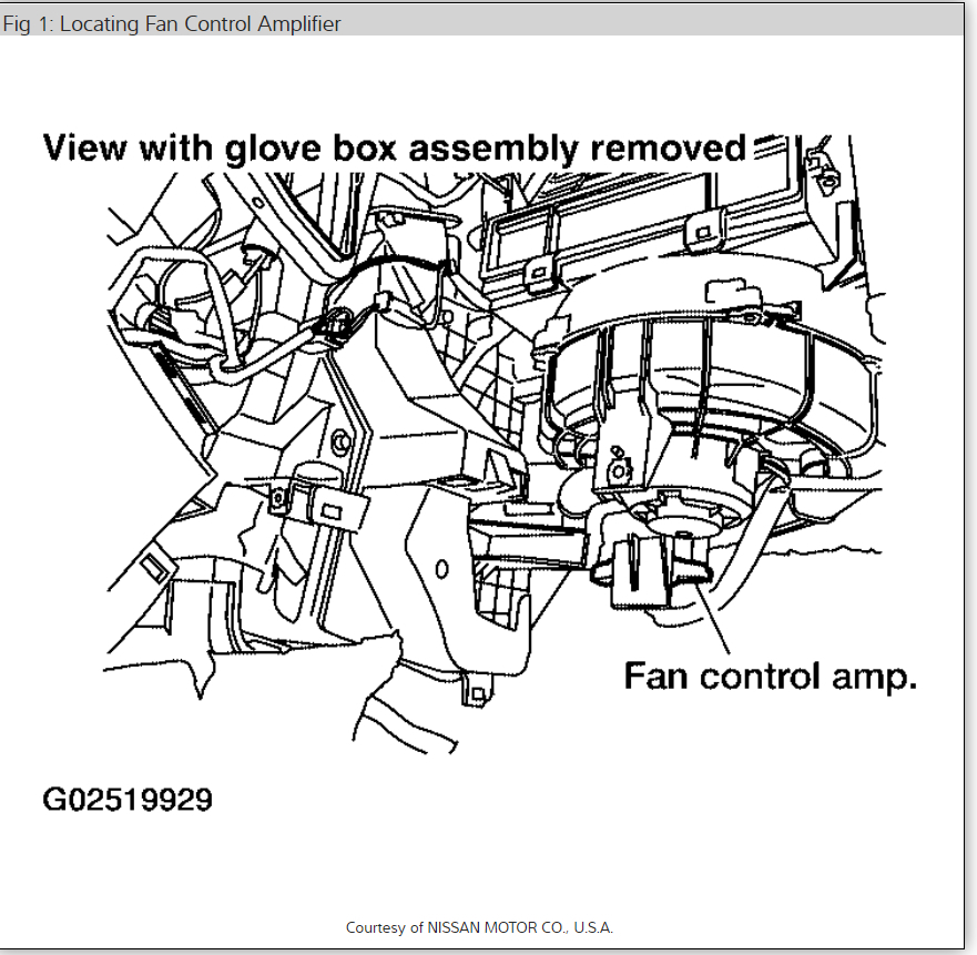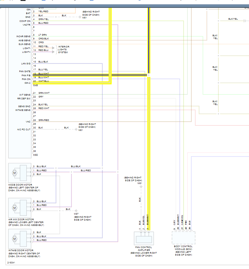 In your vehicle this is called the front air control module. We need to test voltage coming from the highlighted wire when changing speed of the fan and i am sure this will not change. If it does not, then we need to suspect the amplifier is the cause. Basically this changes the resistance of the ground to change the speed of the fan.