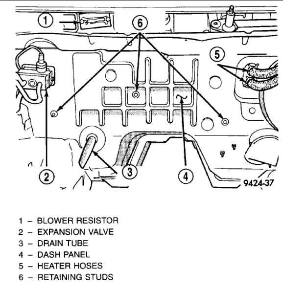 3. Drain cooling system and remove heater hoses at the dash panel. Place plugs in the heater core outlets to prevent coolant spillage during unit housing removal.