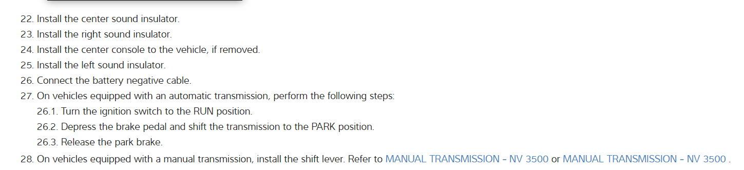 28. On vehicles equipped with a manual transmission, install the shift lever.