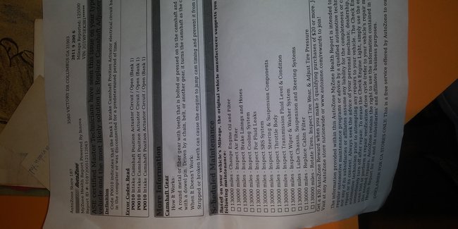 I don't know why the light came on. for 6 years the oil change has been done using regular oil Thursday synthetic oil was used. i am asking you why it would come on? And if it's the cam gear i know that would lick the motor up... I'm getting you the codes... Precision tune told me one thing which is oil cam sensor buy using their machine. AutoZone told me cam gear... I pretty much know those readings are false.. I know my car and a little about vehicles... But being a woman i'm not trying to let these mechanics out here rip me off.