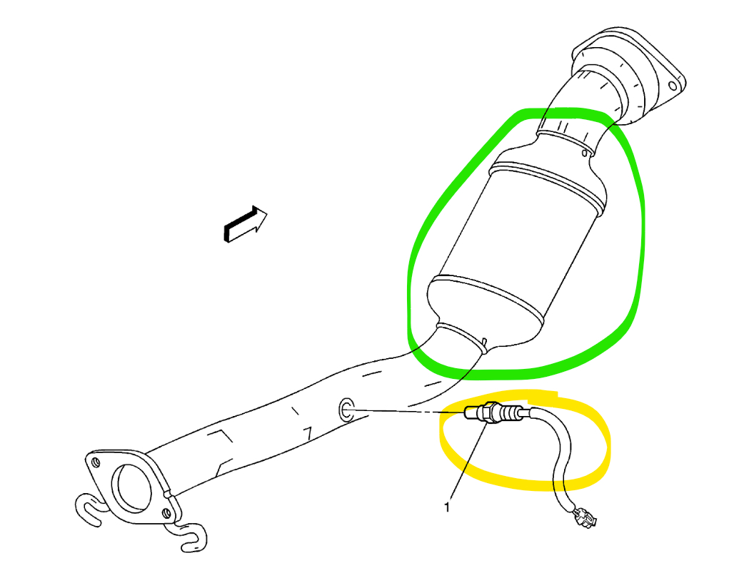 In yellow is the rear Oxygen sensor and in green is the Catalytic Converter