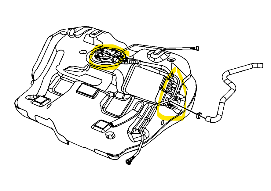 The second diagram is your gas tank looking at it from above, everything in yellow has wiring and electrical connectors going to them. So, the fuel pump wiring is on the very top of the tank and Evap Canister is the square looking box with vapor lines and electrical connectors on it.