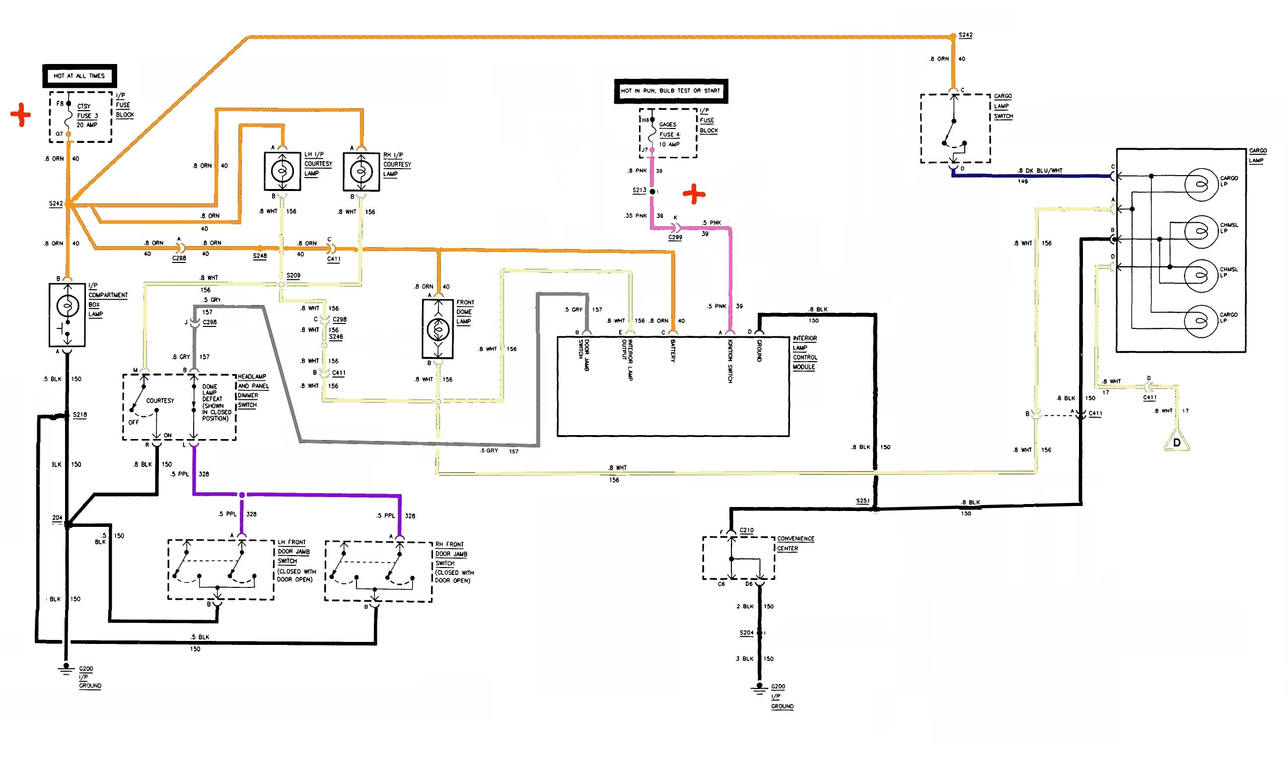 Now if a door is opened and the switches are working, the White wire should turn on the dome lights by providing a ground path for the dome lights and the courtesy lights.