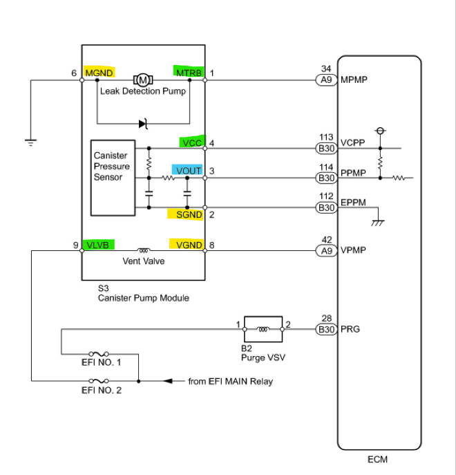 Below is the oem diagram from Toyota for the Evap Canister assembly. The green markers are where a voltage reading would be, the yellow are Ground marks and the Blue is a Signal from the canister pressure sensor. But this system only turns on when certain conditions are met and there is no way for you to know when it will run a self test and or run the evap system.