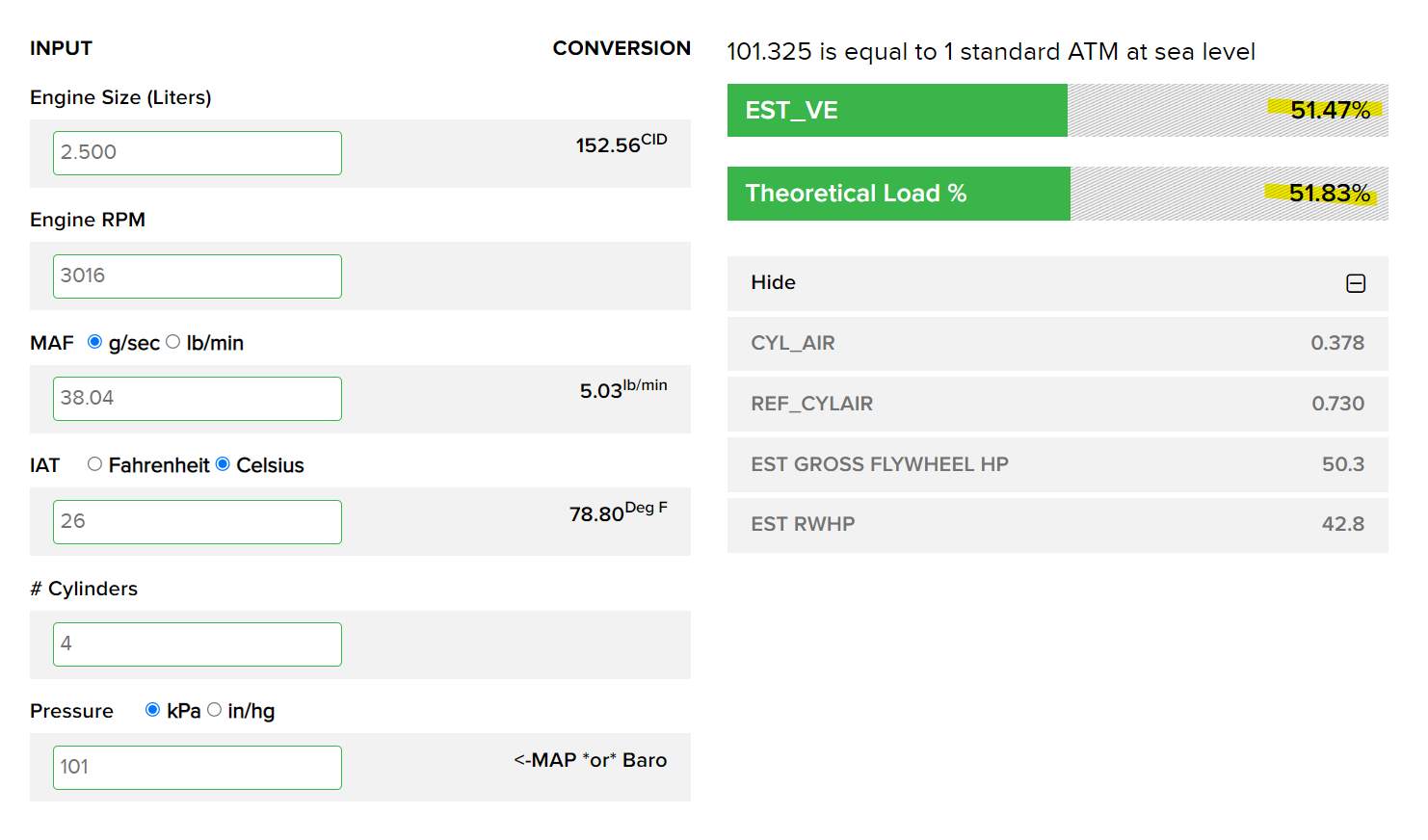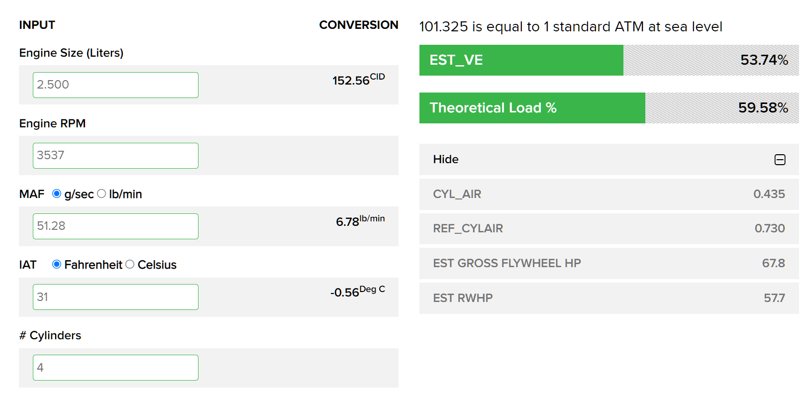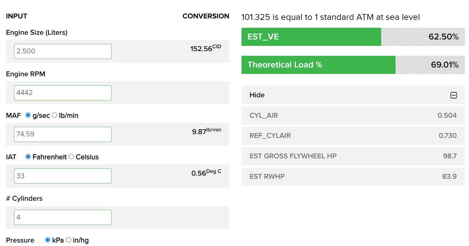 Okay, the numbers look pretty much the same as yesterday. At some points I noticed the Calculated Load reaching 97.25 percent. That was at about 2300rpm, MAF 32.82g/s.