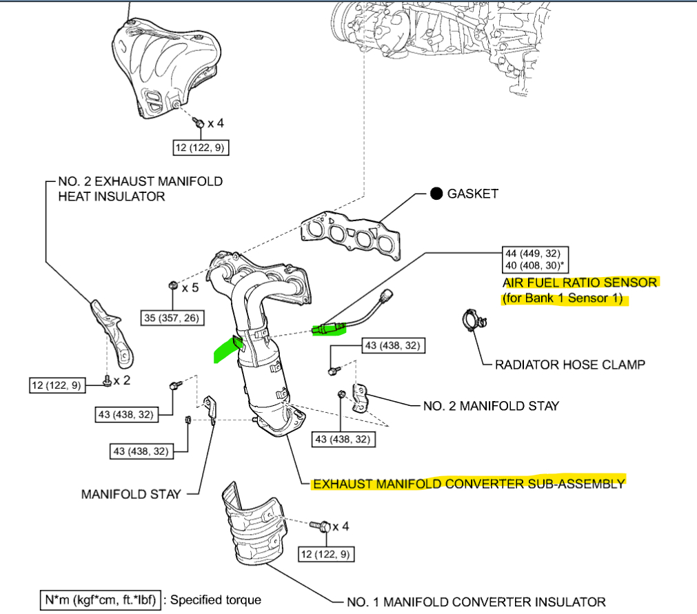 Here is a diagram of the exhaust manifold below with the location of the front Oxygen sensor(Air Fuel Ratio Sensor).