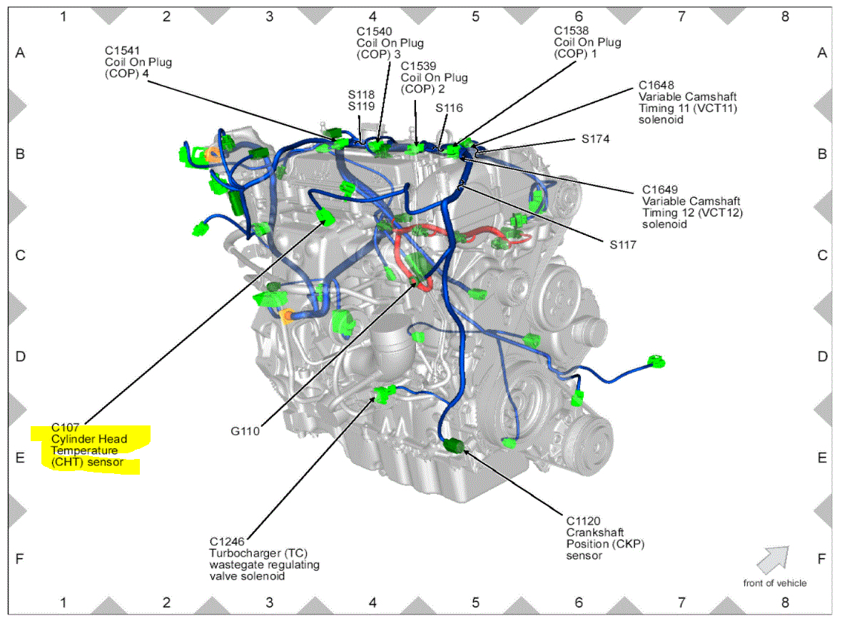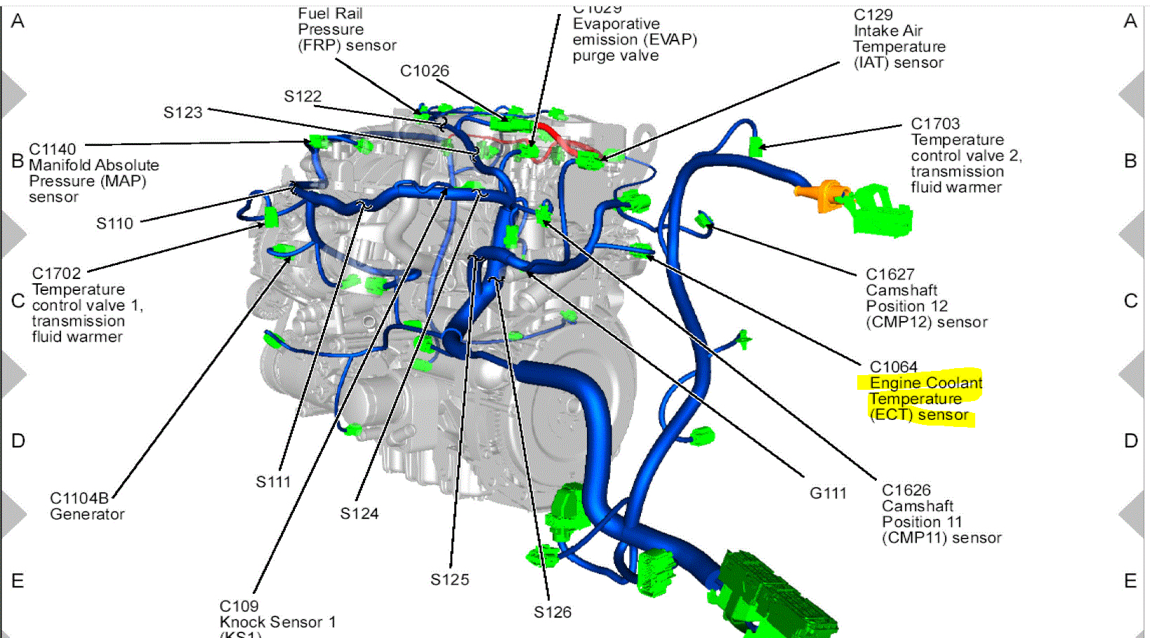 I can tell you the engine coolant temperature sensor is located on the rear of the engine. If you look at the pic below, I highlighted where it is located.
