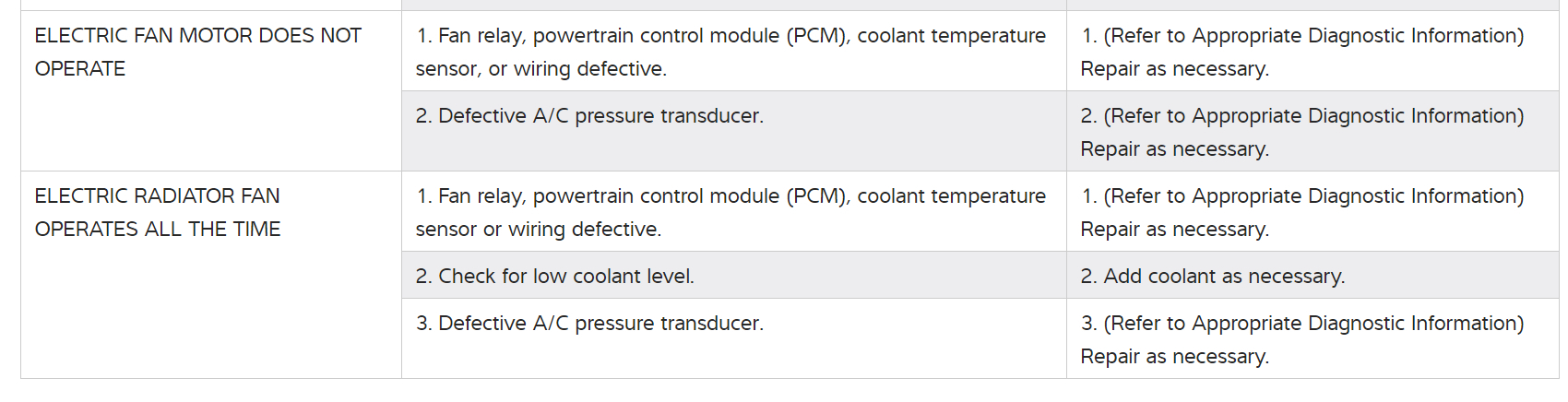 With the temperature still in the low twenties, it is not am issue now, but when the spring gets here I will need it to work! Relay was tested, fuse good, but fan will not engage, even with A/C on. I jumped the fans and they work fine. Dealer said bad PCM or wiring issue as they changed temperature sensor to no avail. Any suggestions would be appreciated.