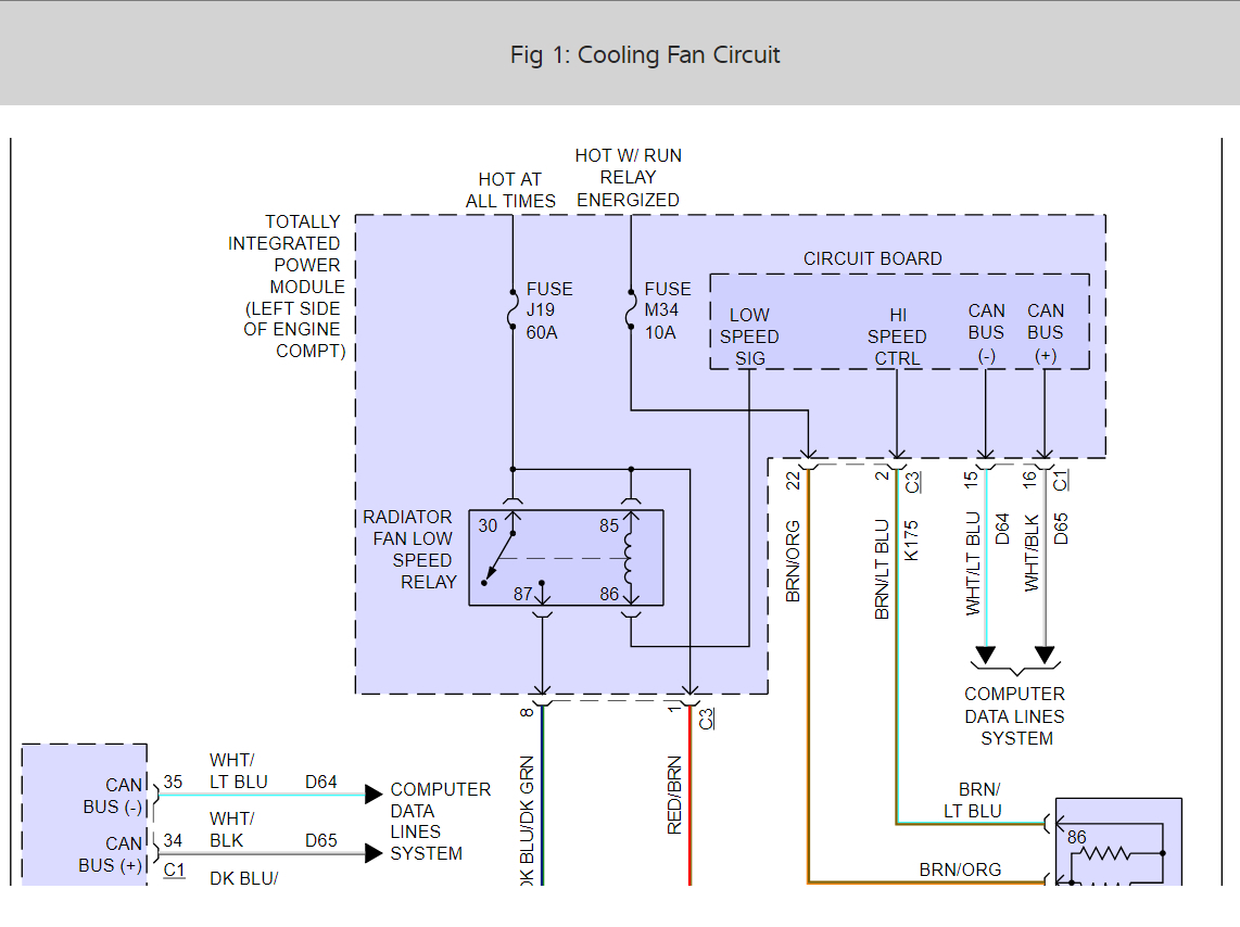 Thanks for the video. The brown and light blue wire going to the high speed fan relay must ground to get the hi fan to turn on. This is controlled by the TIPM. The brown and orange wire must have power.