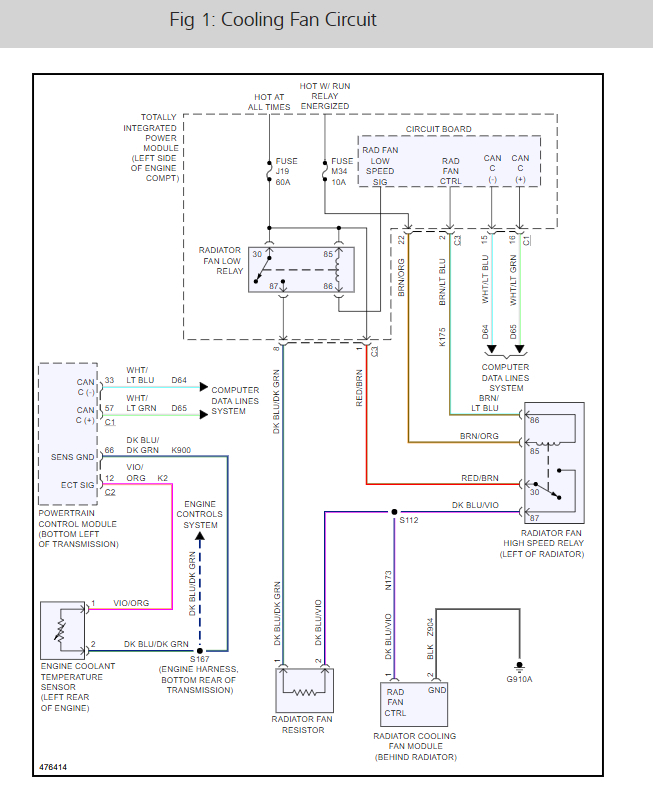 This looks like it could be a problem with the Totally Integrated Control Module. It is on the left side of the engine compartment and it contains Radiator Low Speed Fan Relay, Low Speed Signal, Hi Speed Control, Connector Area Bus Inputs, and fused power. In the diagrams down below I have included factory diagnostic tests for both the cooling system as well the Electronic Coolant Temperature sensor (ECT), and the Totally Integrated Control Module. Please go through these tests and get back to us with what you find out.