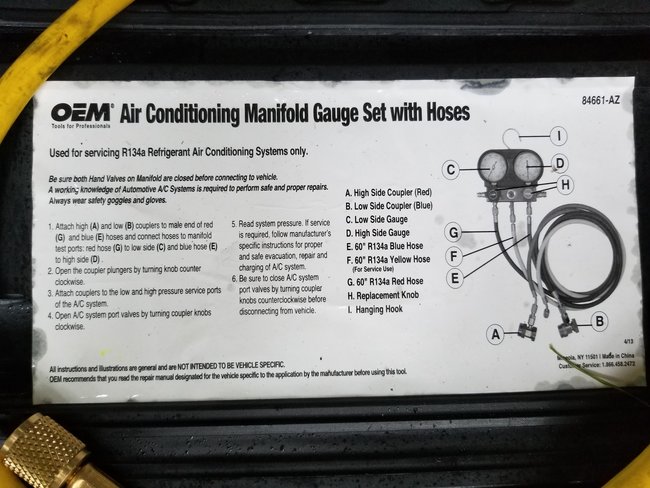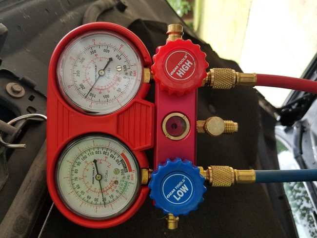 I have a manifold gauge, leak kit, and vacuum "rented" from AutoZone.