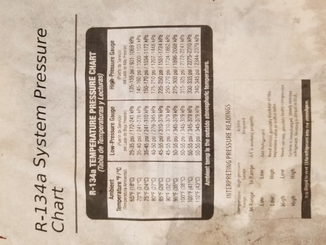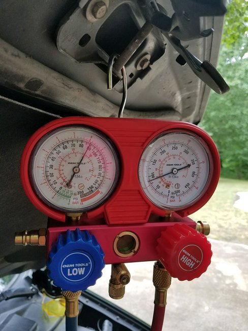 I may have done something wrong to give false readings, though. Can you confirm and take another look at my next image? Previously, I only had the two valves open that were connected to the van. But, I had the two large knobs closed that are attached to the body of the manifold gauge. When I opened all four valves, I got a very different reading. It is basically the same result when the engine is on or off. See image.