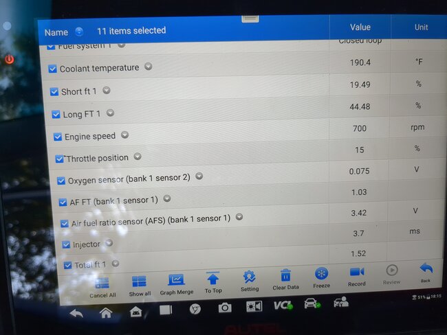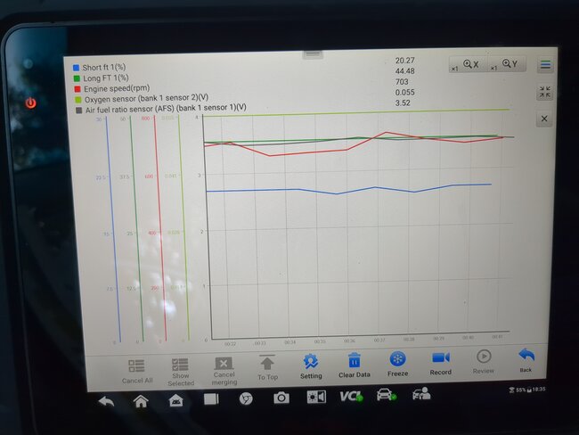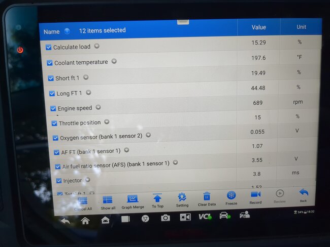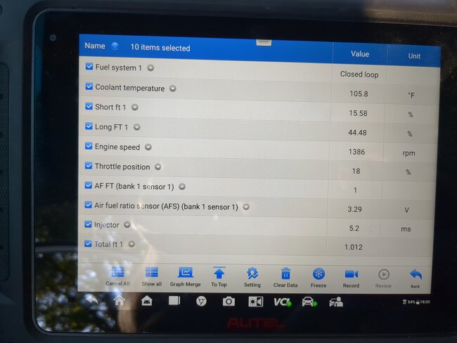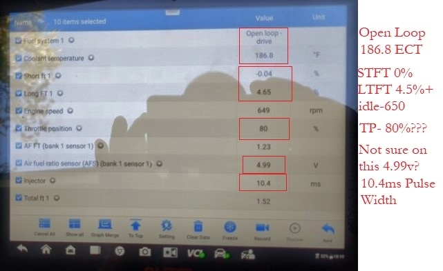 -Removed the battery cable to clear the fuel trims after changes. Afterwards, car would not stay running when the engine was hot. Waited until the engine was cool and it would start but shake violently. Eventually, the fuel trims came back up to around 150% at idle and it ran acceptably. Engine would not take throttle (bog) above current speed range (idle) until fuel trims were relearned (fuel trim increased to ~150%) for that throttle position. WOT still causes a bog with no engine acceleration (AFR sensor = 1.23). Entering any load range where fuel trims are not relearned to ~150% causes engine bog.
