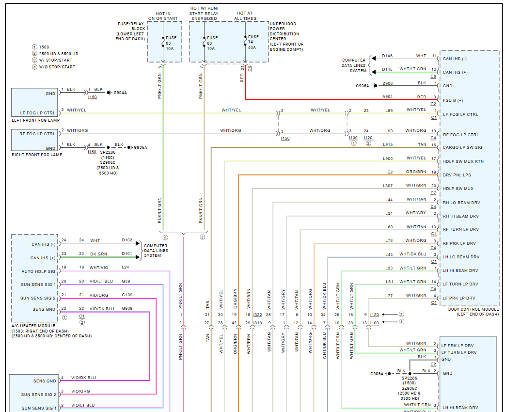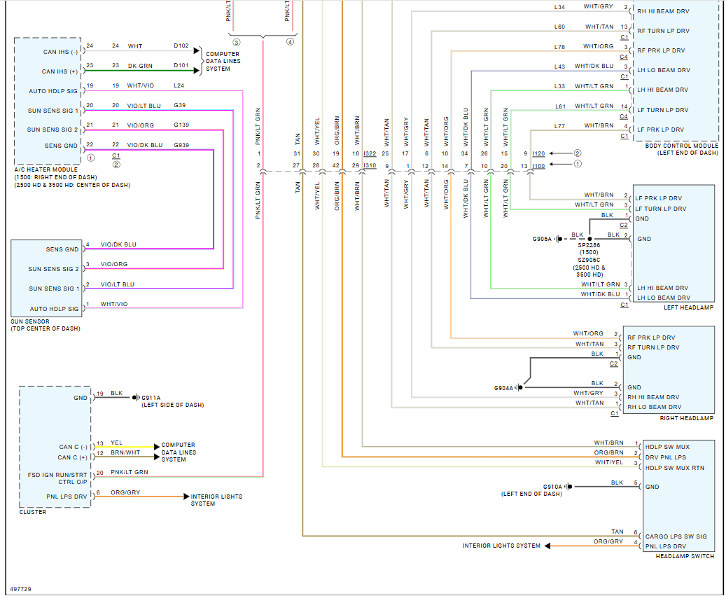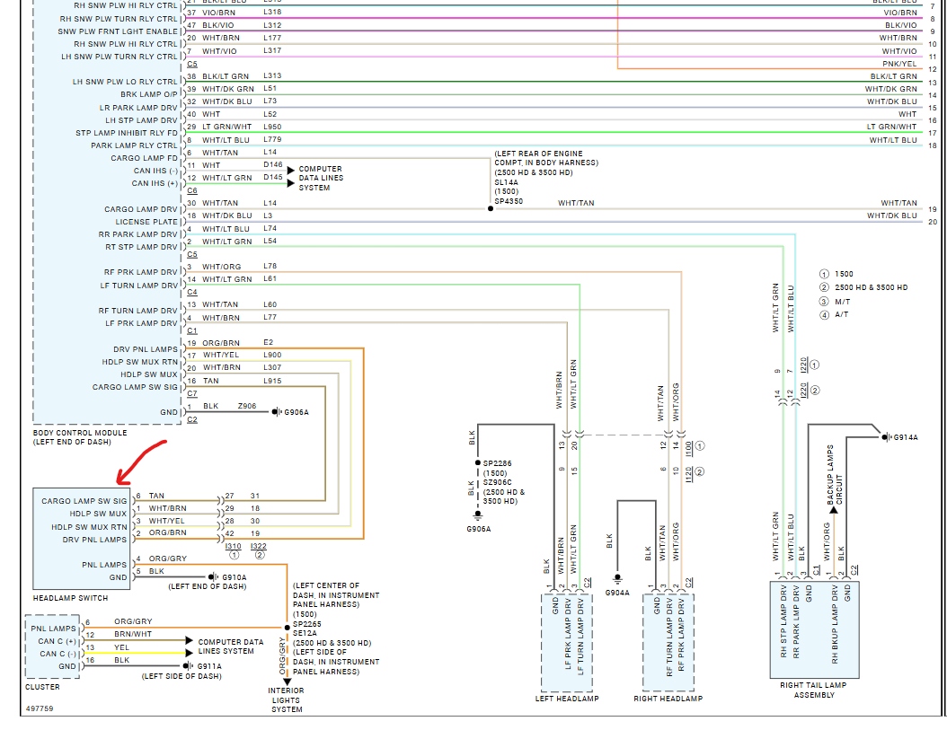 Highbeam headlights do not work. The multifunction switch performs all other functions, turn signals, windshield wiper functions, and flash to pass bright lights all work fine only the bright light function does not work. Using a bidirectional scan tool the bright lights can be commanded on and off, and they function properly. Would like to see a wiring diagram to determine where the control wire from the switch routes to the BCM.