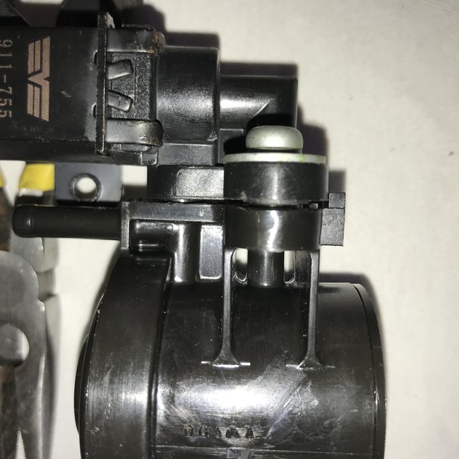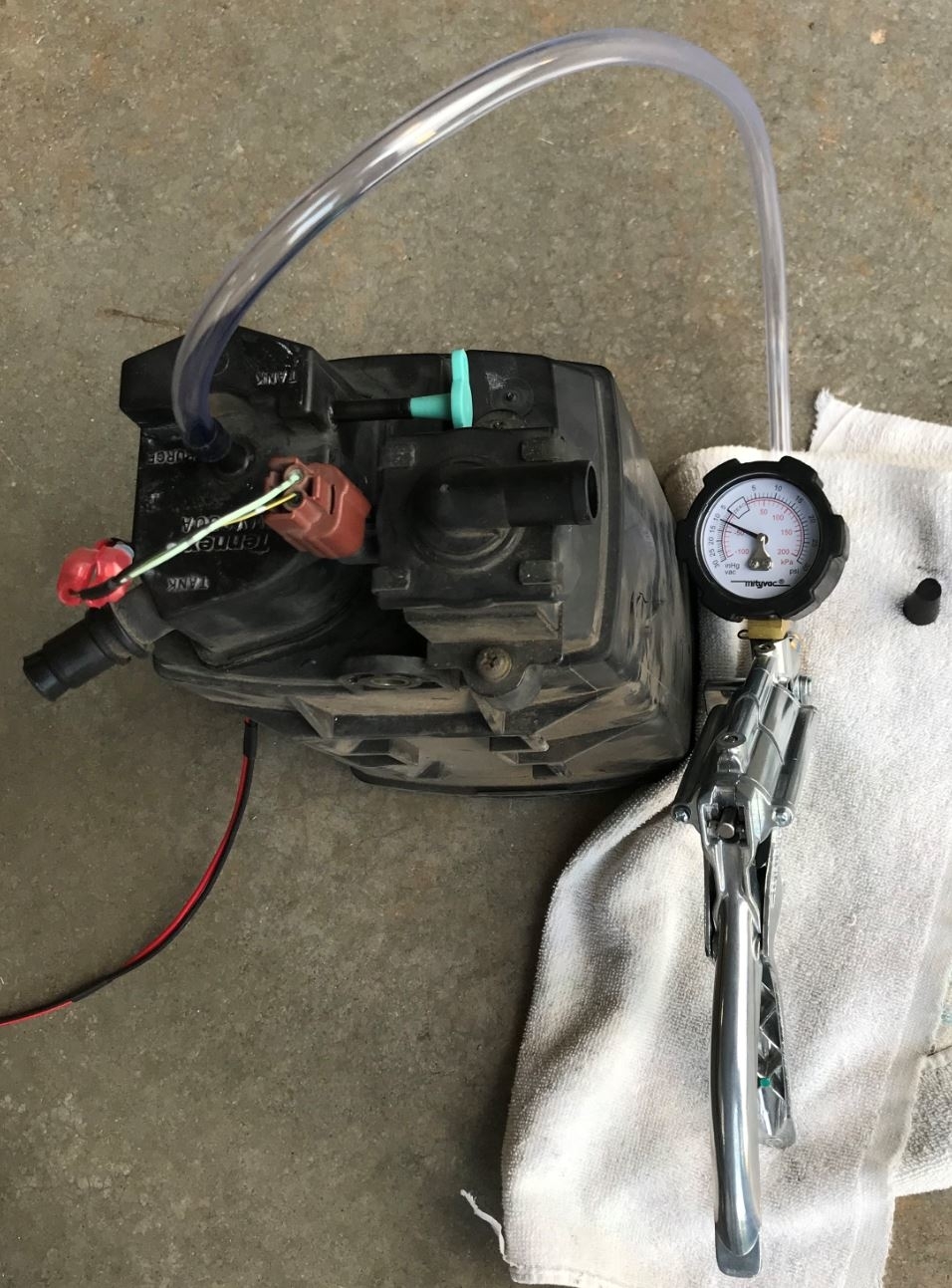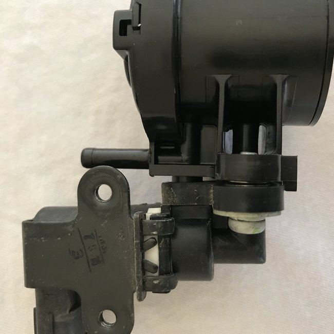 I was surprised because earlier testing a few weeks ago of this same set of parts being testing using the same tools I had slightly different results. In the earlier testing I used 15 InHg but with the 12V applied, when I removed the rubber plug the vacuum dropped to around 8 InHg. The 9/21/2018 test used 10 InHg but it held with the 12V applied and rubber plug removed. Since the 10 InHg held, I tried to increase the vacuum. I could pump it to around 12 InHg but now it would slowly drop to around 7 or 8 InHg before it would hold. This could be modeling what is going on while driving; the canister vent valve is closed while the manifold vacuum is applied, and there is no rubber plug to help hold vacuum. I think this likely suggests an internal leak. I was able to repeat pumping up the vacuum without the rubber plug in place, and it again slowly (seemed like less than 30 seconds) dropped to around 7 or 8 InHg. (See fourth attached picture.)