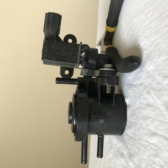 I had intended to next apply pressure (the hand held pump can generate vacuum or pressure depending on a valve setting) and use soap bubbles to test the canister vent solenoid, but I actually forgot to perform that test. Since on the same day I received a new (after market, not a genuine Honda part) canister vent valve, I went ahead and replaced the one that appeared to be leaking based on testing above. (See fifth attached picture, new part installed, old part next to canister.)