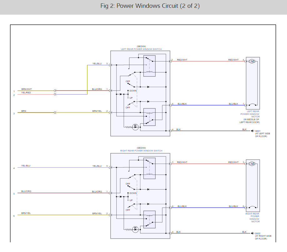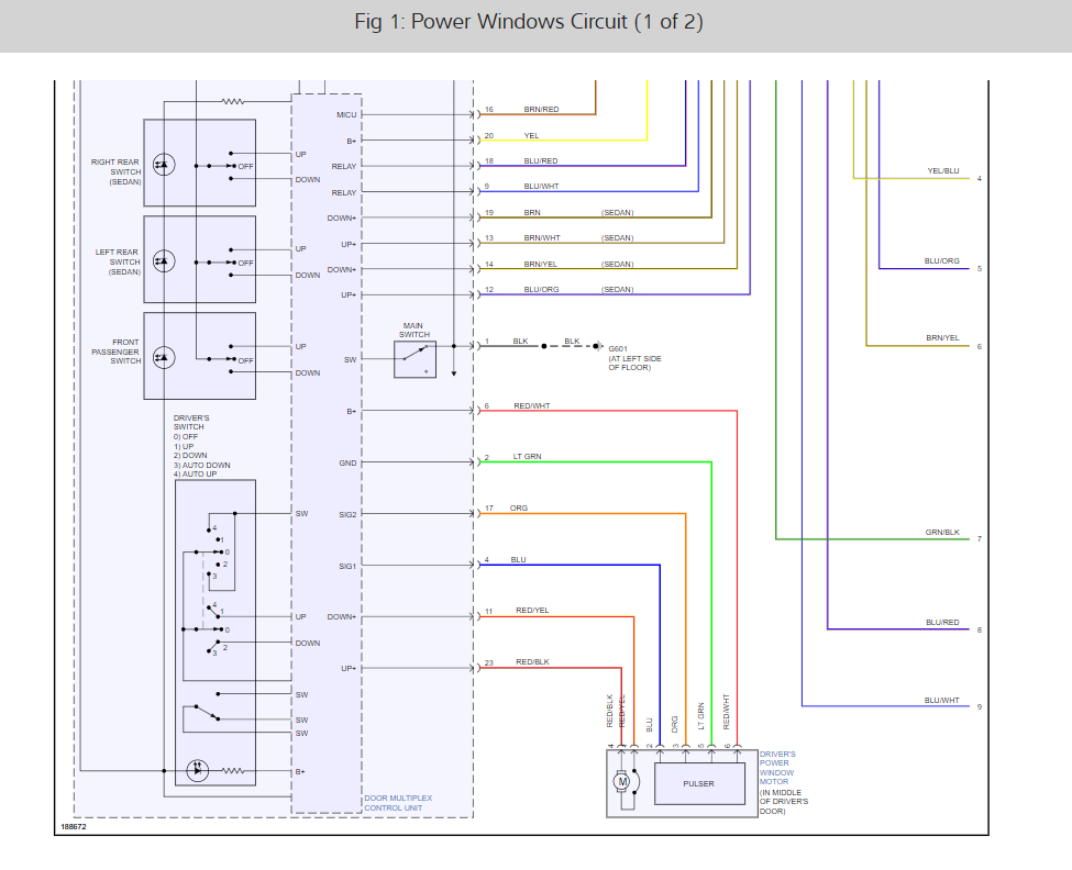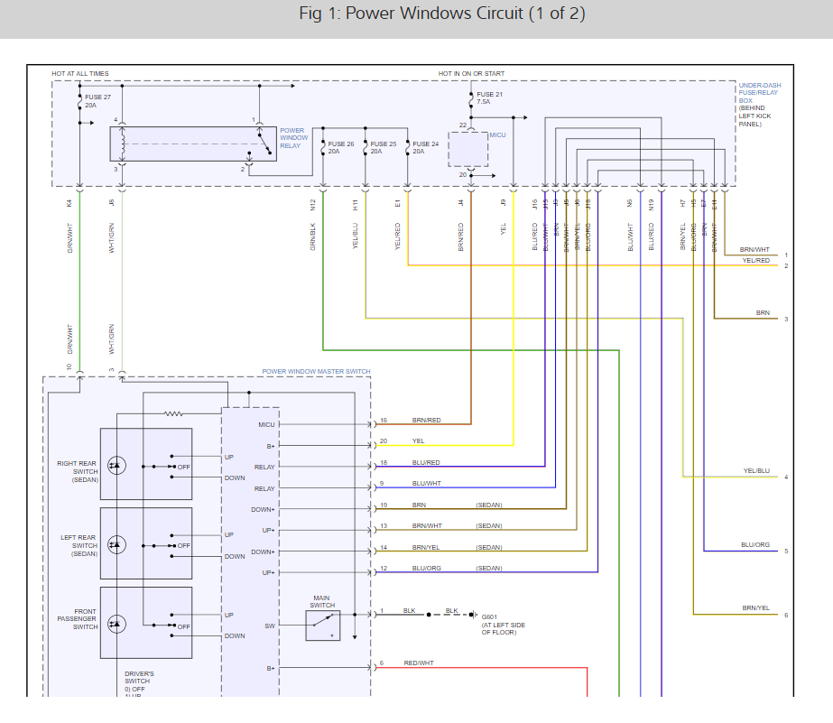 There can be up to 22 wires and some of them will be the same color with the same color stripes. If you mix these up, everything will still work, but you might pop an automatic resetting circuit breaker if the right power window is operated in different directions by two different people at the same time. To avoid confusion, start with the broken wires, then move on to the wires with cracked insulation.
