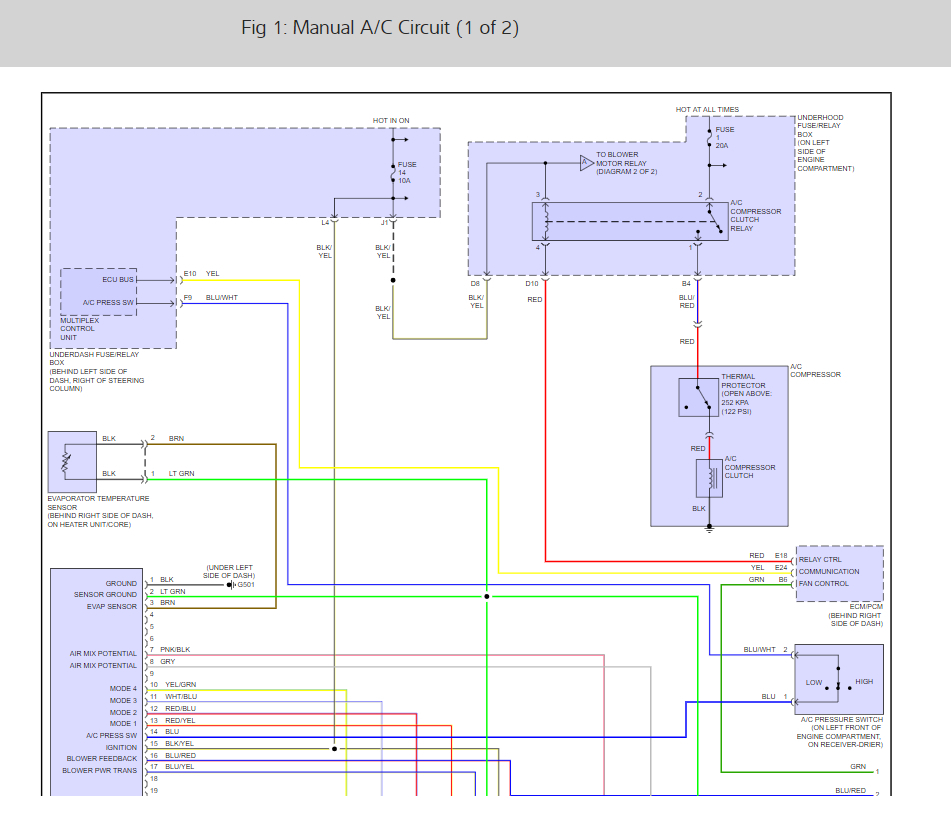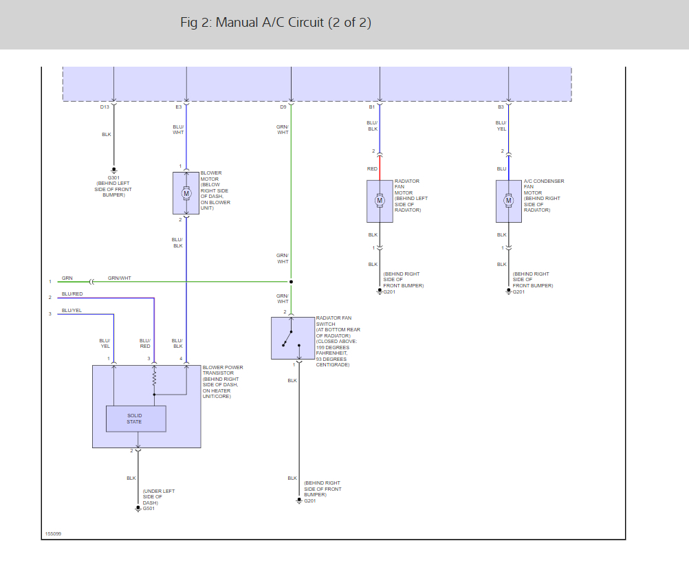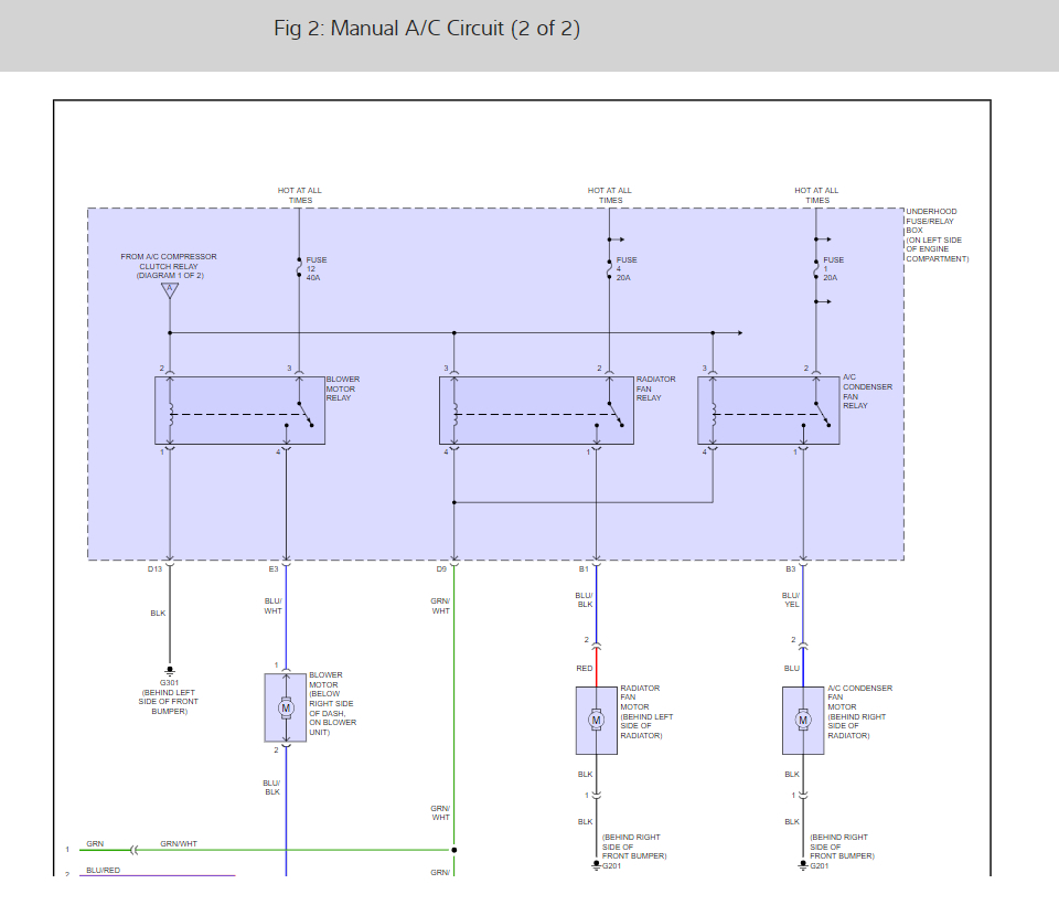 YES - Repair open in the BLU/WHT wire between the blower motor relay and the blower motor.