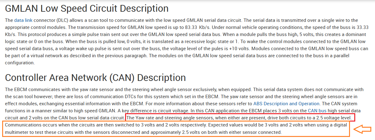 So, this part of the HS can bus in service info is important to know if you are limited to a multimeter in this case, But this has to do with ABS module issues, It states here that the voltage level changes from the normal 2.5-volts of bias voltage like a regular Can Bus network, to a voltage level of 3volts and 2-volts when the Yaw Rate sensor or Steering Angle Sensors are disconnected. Just something to keep in mind if you see 3 or 2 volts levels.