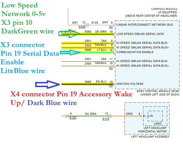 I have also highlighted the Accessory Wake-up from the ECM (dark blue wire) and the Communication Enable from the BCM (light blue wire).