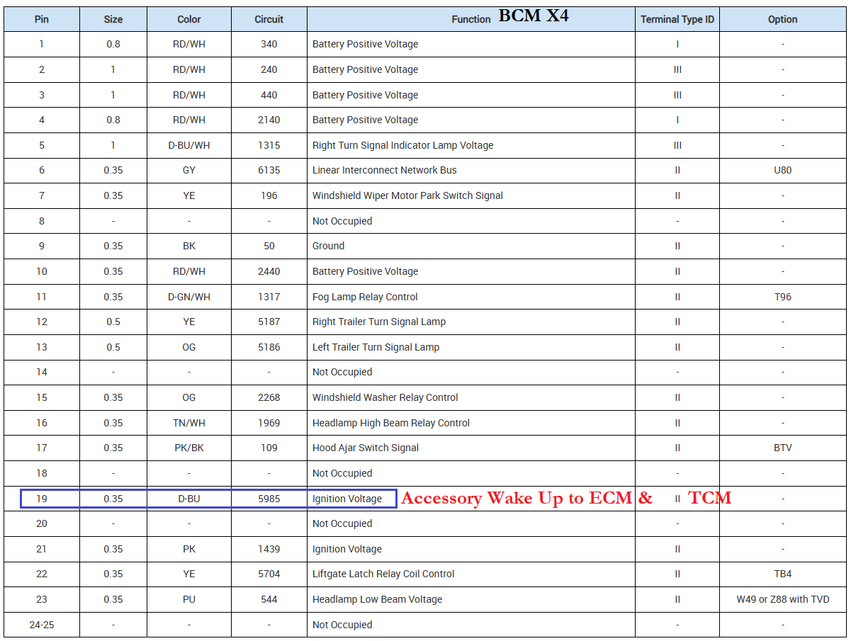 I'll look into operations for this year, but at least not you can locate the BCM, I'll find out which connector the wake-up signal is from the ECM, which is going to be Ignition Voltage, and the Communication Enable wire from the BCM connector X4.
