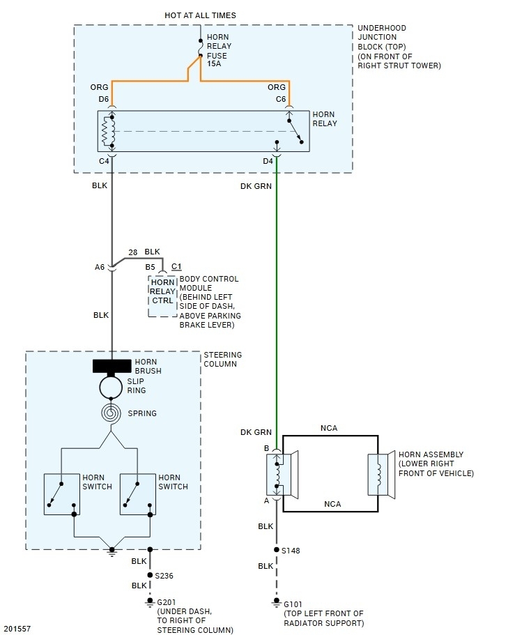 That car has a simple horn system compared to some. The fuse feeds the relay and the switch in the column simply provides a ground that turns the relay on. The relay then sends power to the horns. To find the problem I would first pull the relay out and install a fuse. If it still fails instantly the issue is probably in the junction block the relay is in on the orange wire that feeds the horn relay. I would suspect the issue is on that side anyway as the relay isolates the other parts of the circuit. If the short was on the control side like the horn switch or the BCM, the relay would be stuck on and because that side goes to ground through the relay it would either cause the horns to stay on all the time or it would burn the coil in the relay to an open circuit and the fuse wouldn't blow. If the relay was bad and the contacts were fused, then the horns would also be on all the time. As you don't say that they are on or that they sound for a while when the fuse is installed it points to it being in the fuse to junction block wiring.